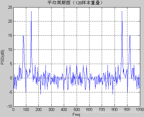 结果比前面例子低30dB,这是因为pwelch函数将计算的功率谱结果除以抽样频率fs, 因为fs = 1000Hz,所以10*log10(1000)正好为30dB。