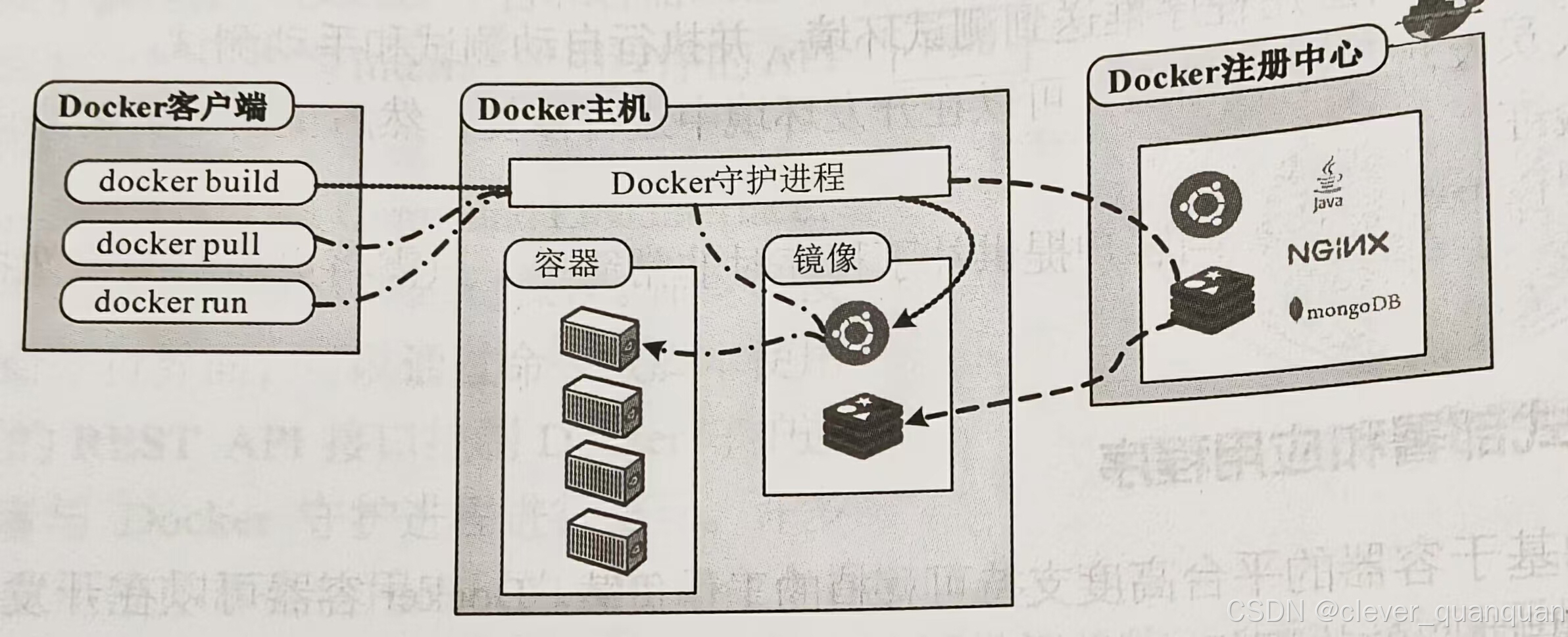 服务器:即docker守护进程,是docker后台应用程序,可使用docker命令进行管理,可用于创建和管理docker对象