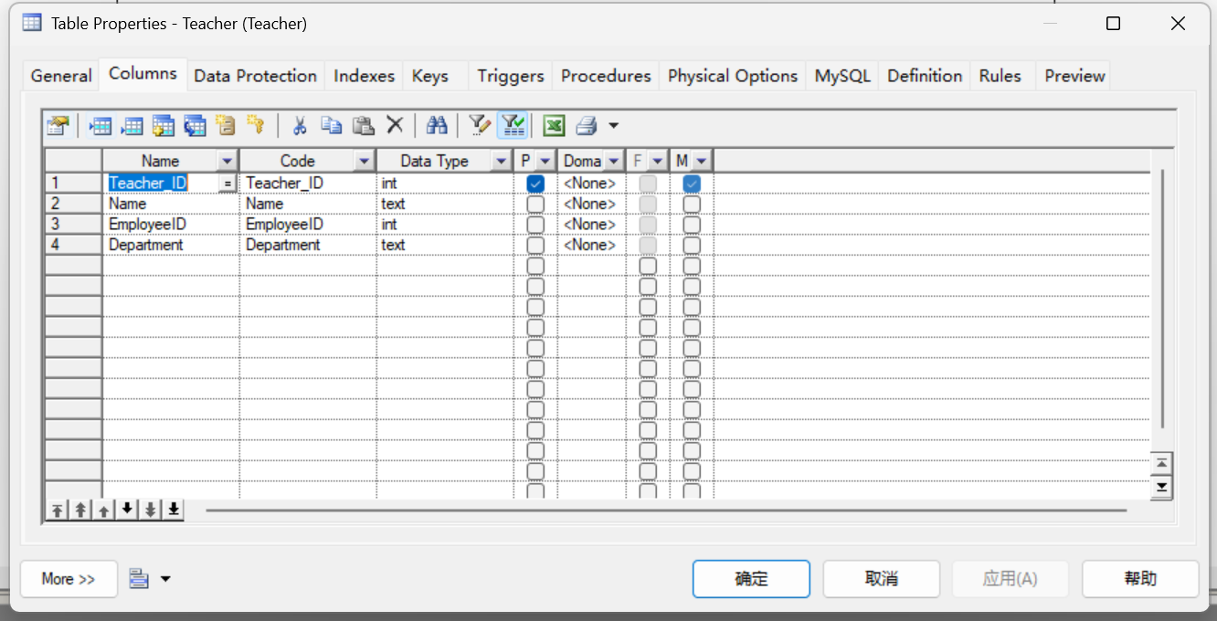 | 一、实验目的 使用 PowerDesigner+MySQL 设计数据库 二、实验内容 ① 使用 PowerDesigner 设计教师端签到应用程序数据库逻辑模型, ② 将数据库逻辑模型转成物理模型: ③ 在 PowerDesigner 中通过 ODBC 数据库桥连接 MySQL 数据库; ④ 将数据库模型导入 MySQL 数据库中生成数据库表 三、实验步骤 实验解决方案:使用 PowerDesigner + MySQL 设计教师端签到应用程序数据库 步骤 1:需求分析与概念设计(前期准备) 涉及的功能模块: