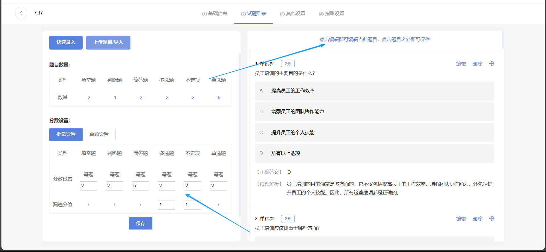 企业可根据岗位、部门、知识点等维度搭建专属题库,支持单选、多选、判断、不定项、填空、简答、分析等多种题型录入。组卷时,管理员只需选择试卷输入题目数量系统就能自动从题库中随机抽取题目生成试卷,还可以对题目在线编辑。
