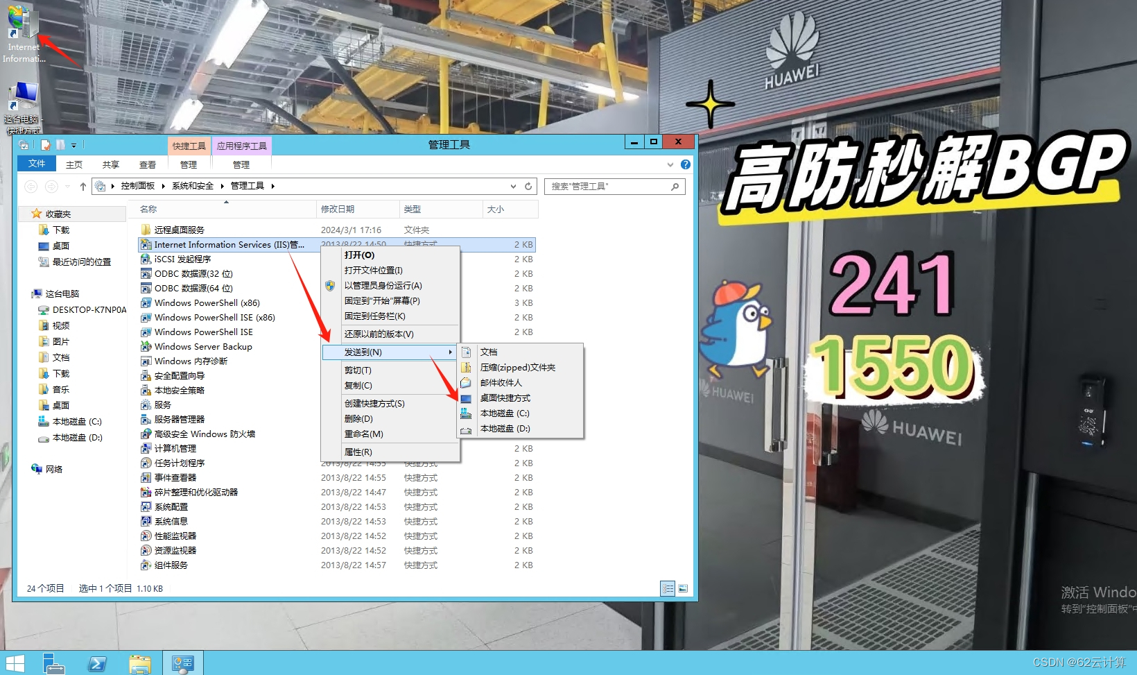 11、添加桌面快捷方式:点击【开始】——【管理工具】——右键【Internet 信息服务(IIS)管理器】——【发送到】——【桌面快捷方式】