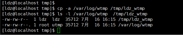 例题:你能否使用 用户的身份(这里为ldz),完整的复制/var/log/wtmp文件到/tmp下面,并更名为 ldz_wtmp呢?