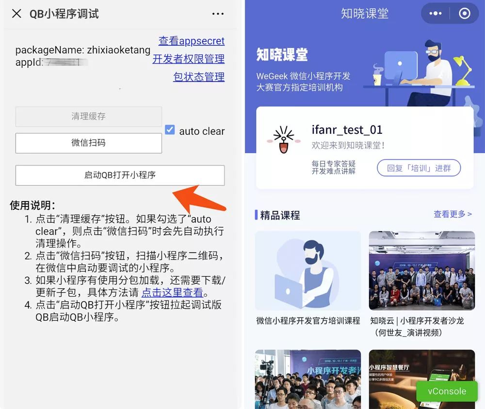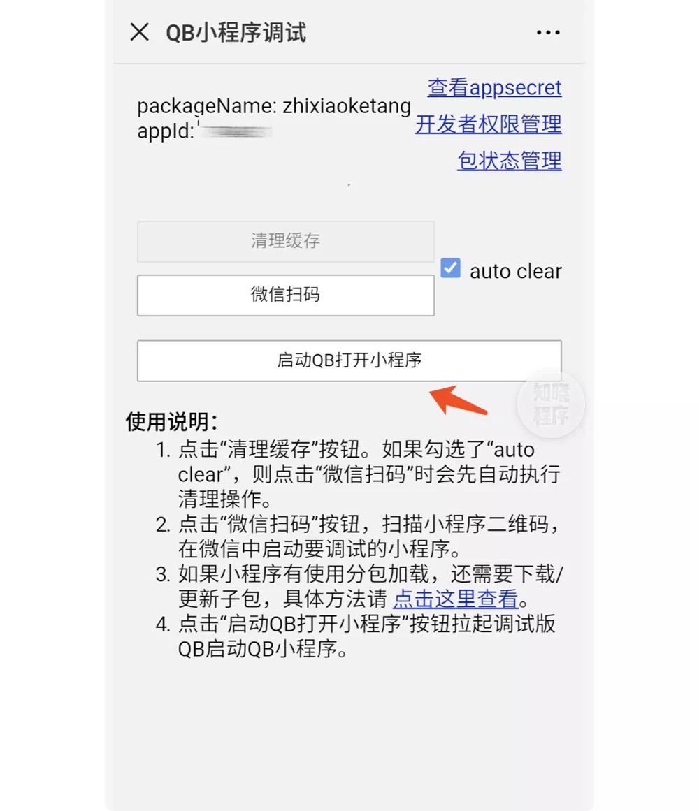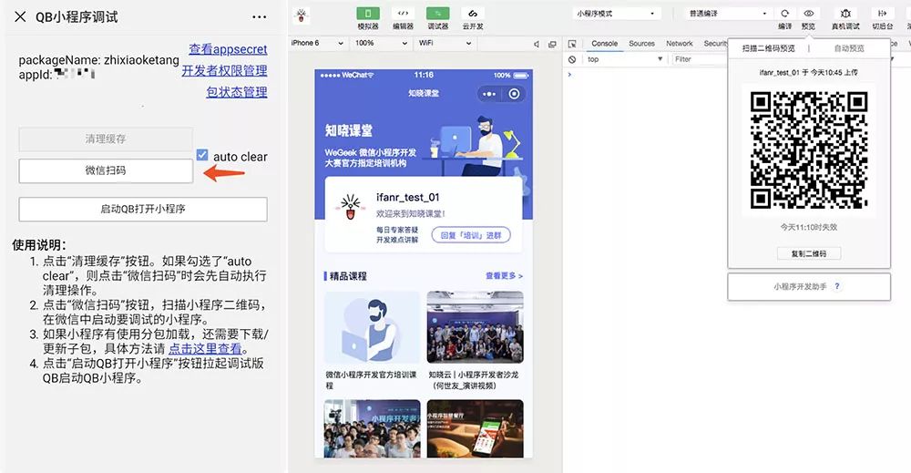 1. 使用微信扫描二维码进入 QB 小程序调试页面。