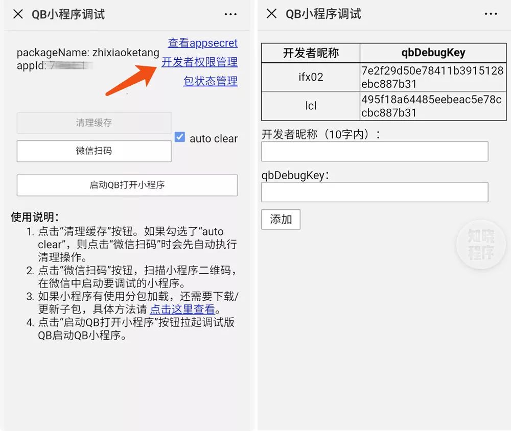 在此页面中,你可以点击「开发者权限管理」添加其它开发设备,需要输入待添加设备的 qbDebugKey 和昵称,添加成功后,新设备就可以使用该 packageName 进行登录了。