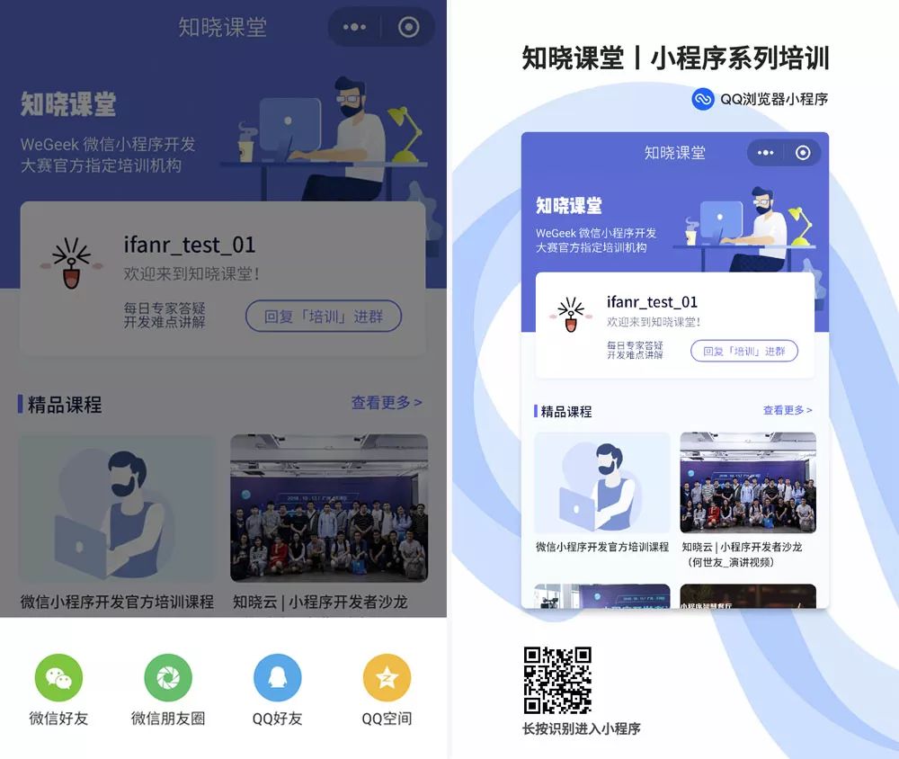 4.关于分享问题。QQ 浏览器小程序可以分享到微信朋友圈、微信好友、QQ 好友、QQ 空间,和微信小程序分享不同的是,QQ 浏览器小程序分享是创建一张分享海报,里面有 QQ 浏览器小程序二维码,在安卓手机中长按识别即可自动打开小程序。