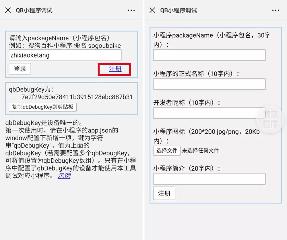注意:只有在 app.json 里配置过测试机生成的 qbDebugKey,测试机才能使用 QQ 浏览器小程序调试工具调试该小程序。一台手机对应一个 qbDebugKey。