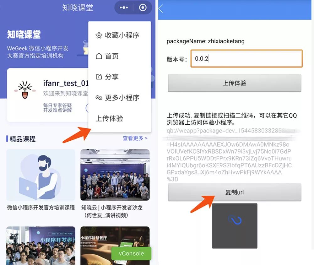 3.预览没问题之后就可以上传一个体验版,输入版本号,上传成功后会有一个 url 返回,复制这个 url 到 QQ 浏览器中就能打开小程序了。