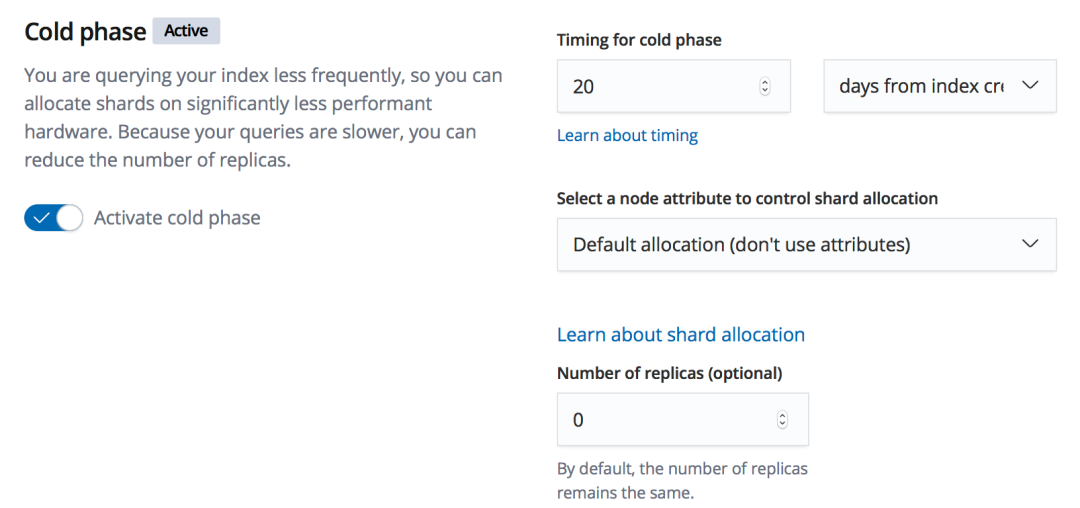 此处的 timing 是创建时间 20 天后,需要保证在第二步骤中,对过去老索引数据备份先执行完成后才可以进入到 cold phase 。