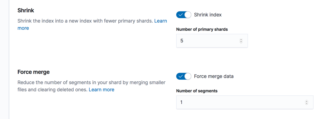 同时,也在 warm phase 阶段,设置索引 shrink ,把索引的分片数缩成 5 个。因为老的索引已经不执行写入了,所以也可以执行 force merge , 强制把 segment 文件合并为 1 个,可以获得更好的查询性能。