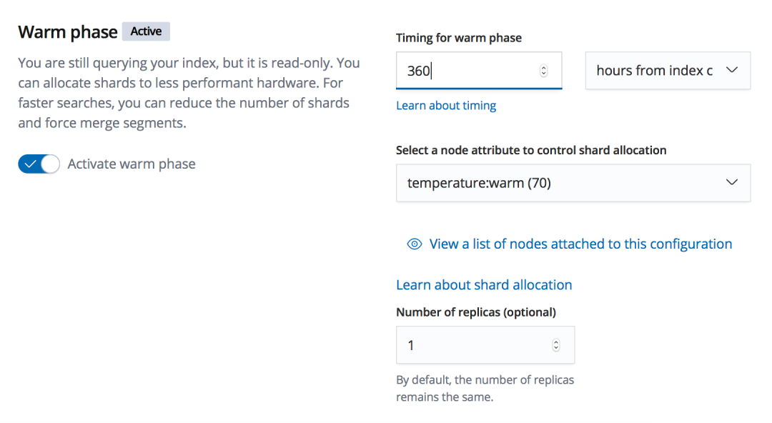 在 warm phase , 把创建时间超过 360 小时的索引从 hot 节点迁移到 warm 节点上,保持索引的副本数量为 1 。