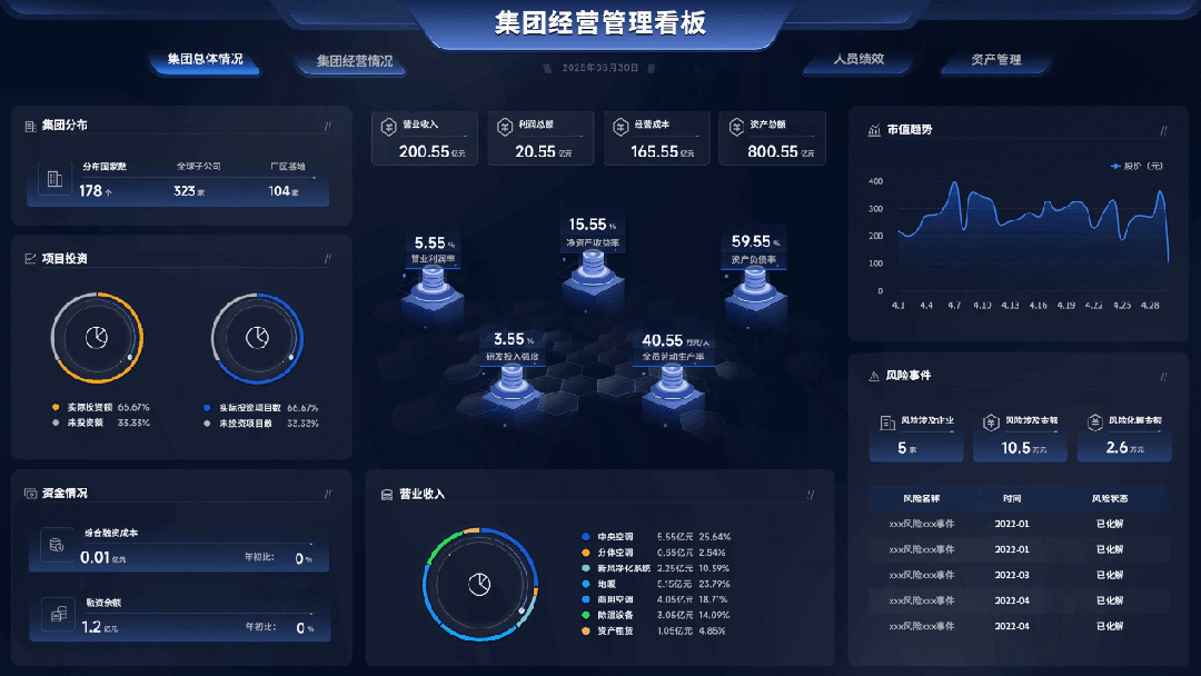简报可紧围绕金融企业整体业务经营情况,建设高度集成的数据可视化系统,汇聚金融企业的业务、经营、风控、投资、大事件等关键数据,从多维度进行分析展示。相关人员可以通过系统实时掌控企业的整体经营情况、风险状况,为领导决策提供数据支撑。