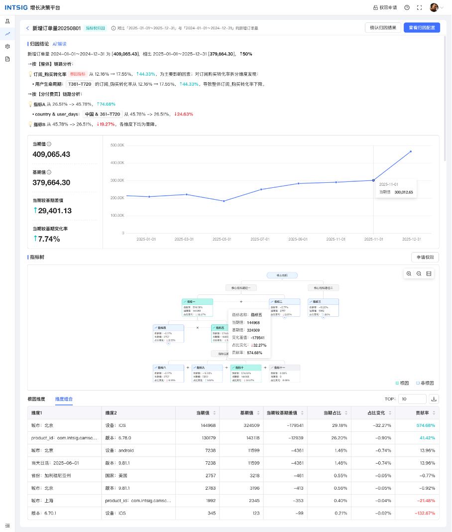 指标智能洞察是合合信息自研的一站式业务指标异常分析工具,核心聚焦指标波动归因——通过自研创新的指标归因算法,基于多层指标树和多维度交叉分析,可直接定位影响波动的核心指标及对应根因维度组合(如 “城市 × 设备 ×版本 ” ),帮助业务方快速锁定异常源头。