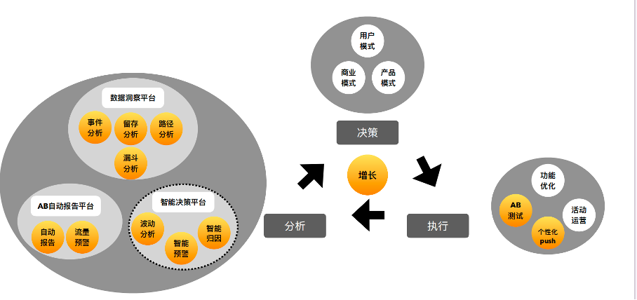 分析环节:依靠数据洞察平台(事件、留存、路径、漏斗分析)、AB 自动报告平台(自动智能报告、流量预警)、智能决策平台(波动分析、智能预警、智能归因),对业务数据进行多维度、自动化且智能化的剖析,挖掘业务现状与问题。