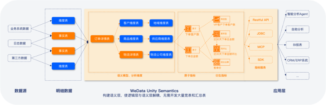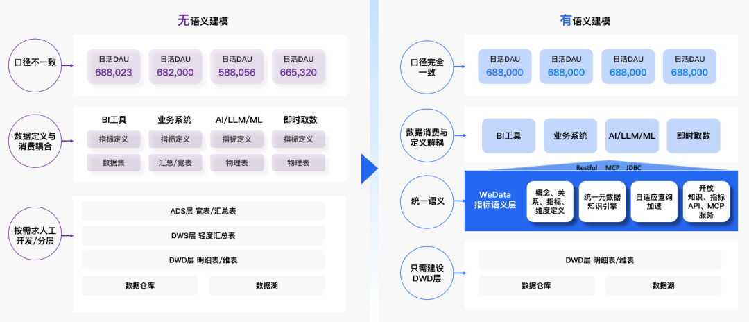 WeData Unity Semantics可作为企业业务数据服务的统一中台,通过统一语义建模、标准化数据服务等,实现了数据口径的一致性、数据使用的便捷性和数据分析的准确性,为企业数字化转型提供了坚实的数据基础和强大的支撑能力。各个业务系统再也不需要各定义开发指标,从根本上解决数据口径不一致的问题: