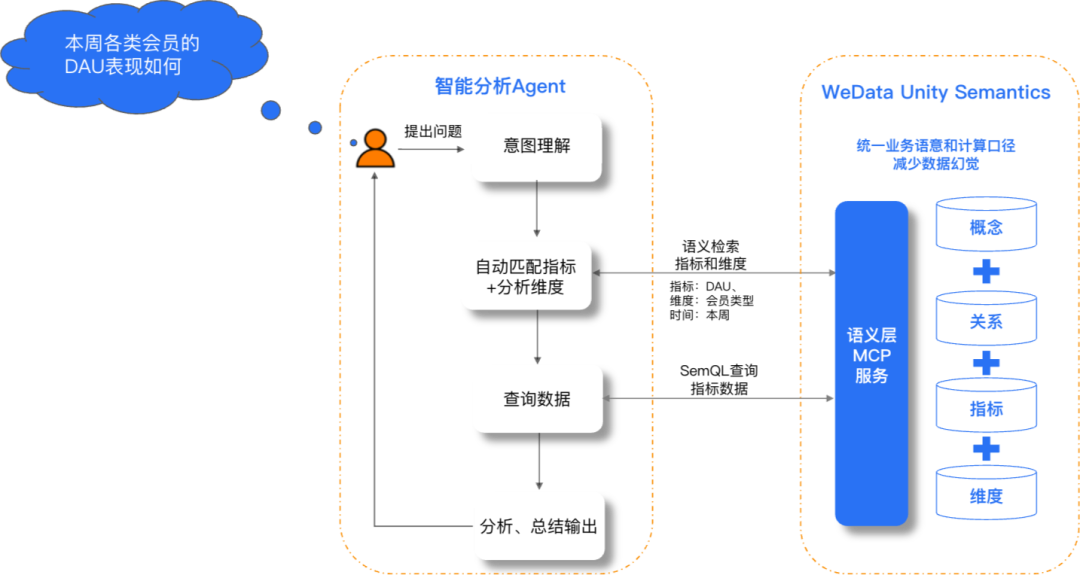 语义层支持开放MCP模型上下文协议(Model Context Protocol, MCP)服务,可供企业内部的智能Agent调用,以获取准确、一致的业务数据。例如,营销策划人员可通过Agent的自然语言交互界面直接提问:“本周各类会员的DAU表现如何?”。