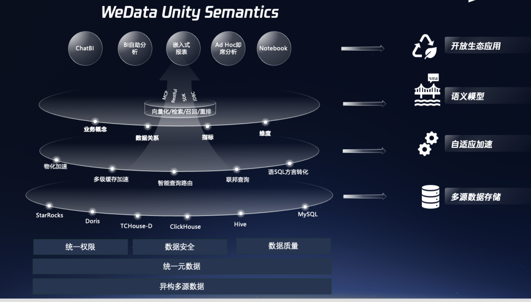 统一服务:开放MCP、JDBC、API接口,降低企业跨团队、跨平台数据交互成本,统一数据服务出口,确保数据有唯一真相来源(Single Source Of Truth)。