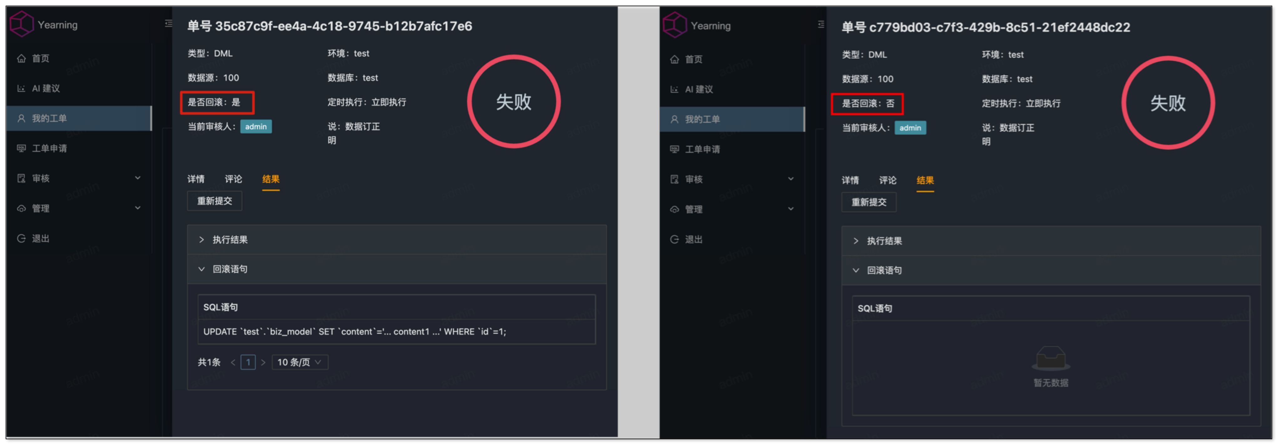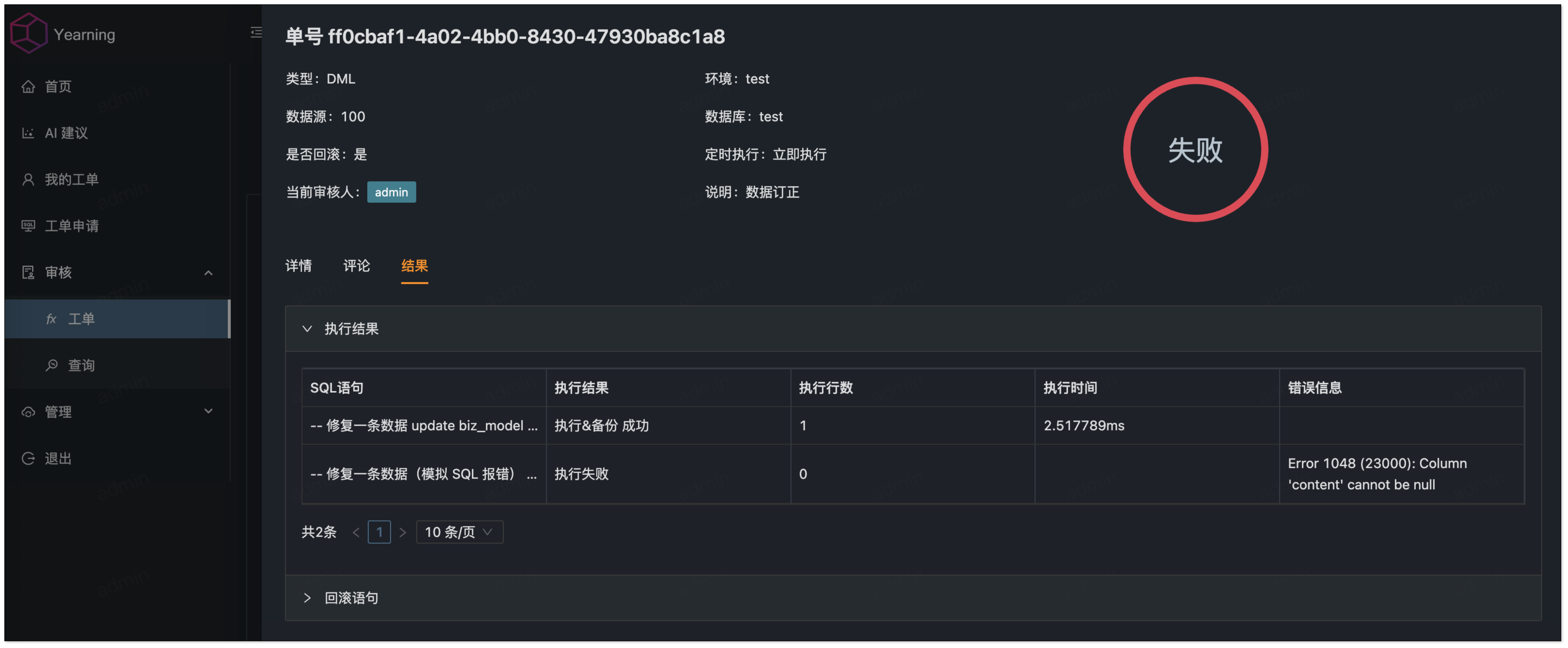 在“数据订正”场景中,Yearning 能在预设的报错语句处成功中止执行。但它不支持报错后的后续处理,如果是一批需要一对一更新的数据,遇到报错后只能新建工单来继续执行剩余 SQL。