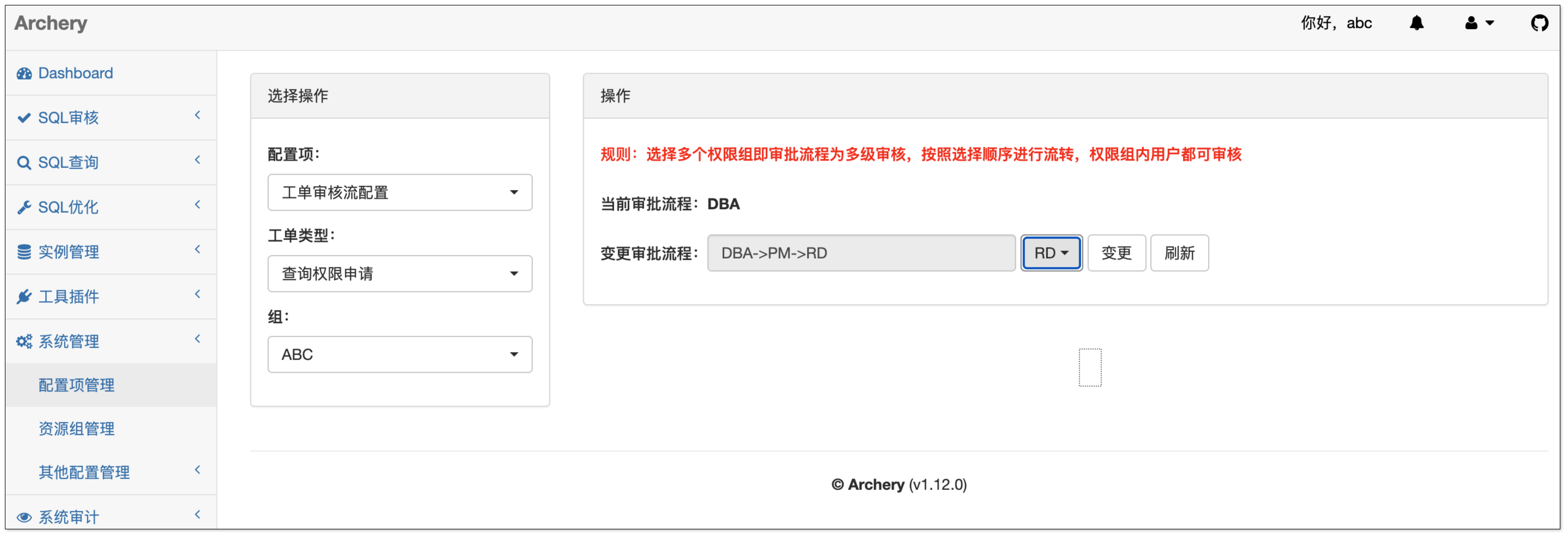 Archery 无法接入外部流程引擎,但可以通过内部特有的方式定义基于权限组的简单审批流程,工单会在不同权限组之间流转,用户可以加入特定权限组参与审批。