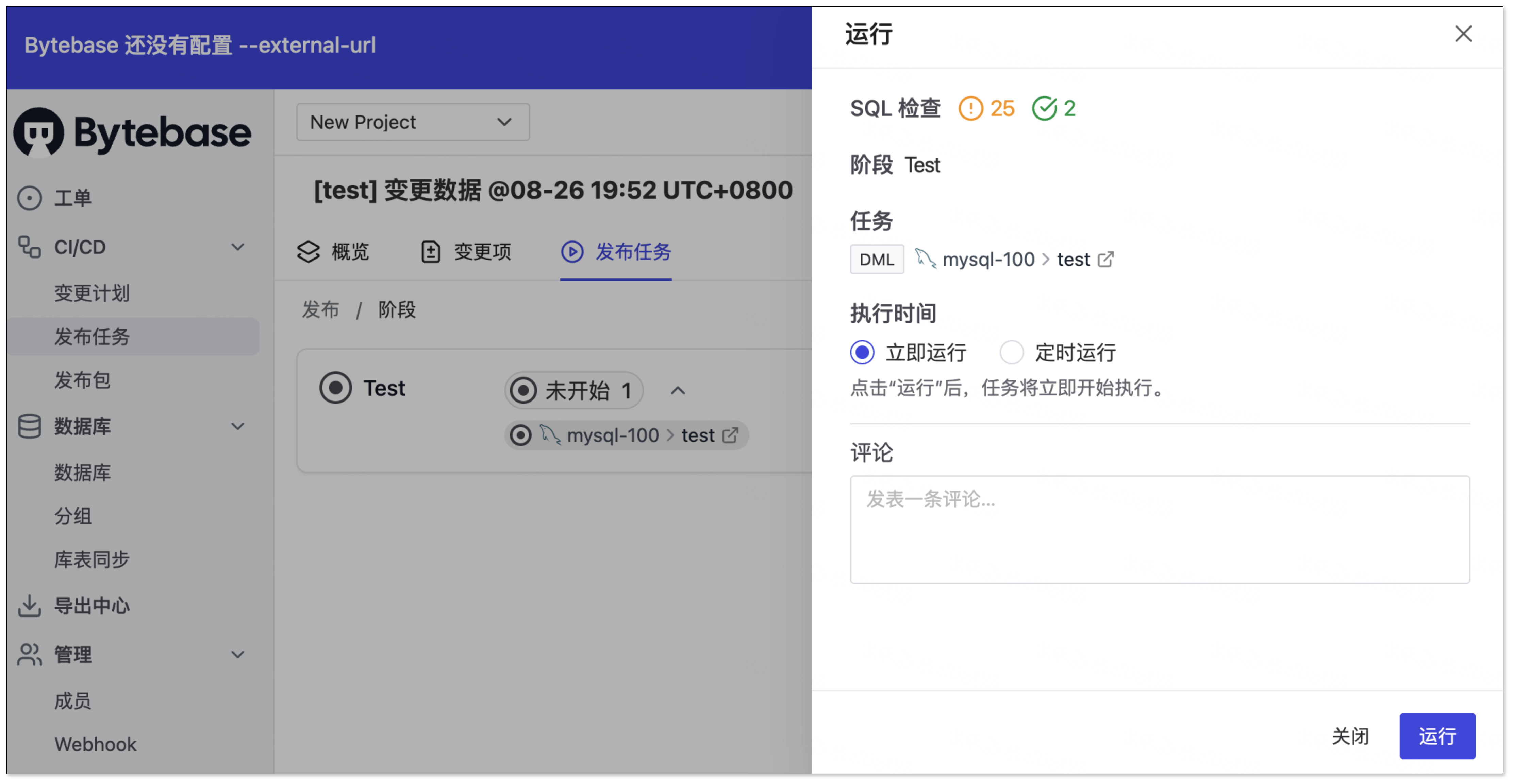 Bytebase 提供了 立即、定时 两种工单执行方式,虽然没有明确提示,但在实际体验过程中发现 Bytebase 在执行工单 SQL 时会默认启用事务。当工单失败,整个变更会被回滚,由于 DDL 回滚操作需要数据库的支持,因此用户需要谨慎对待 DDL/DML 混合情况的工单。