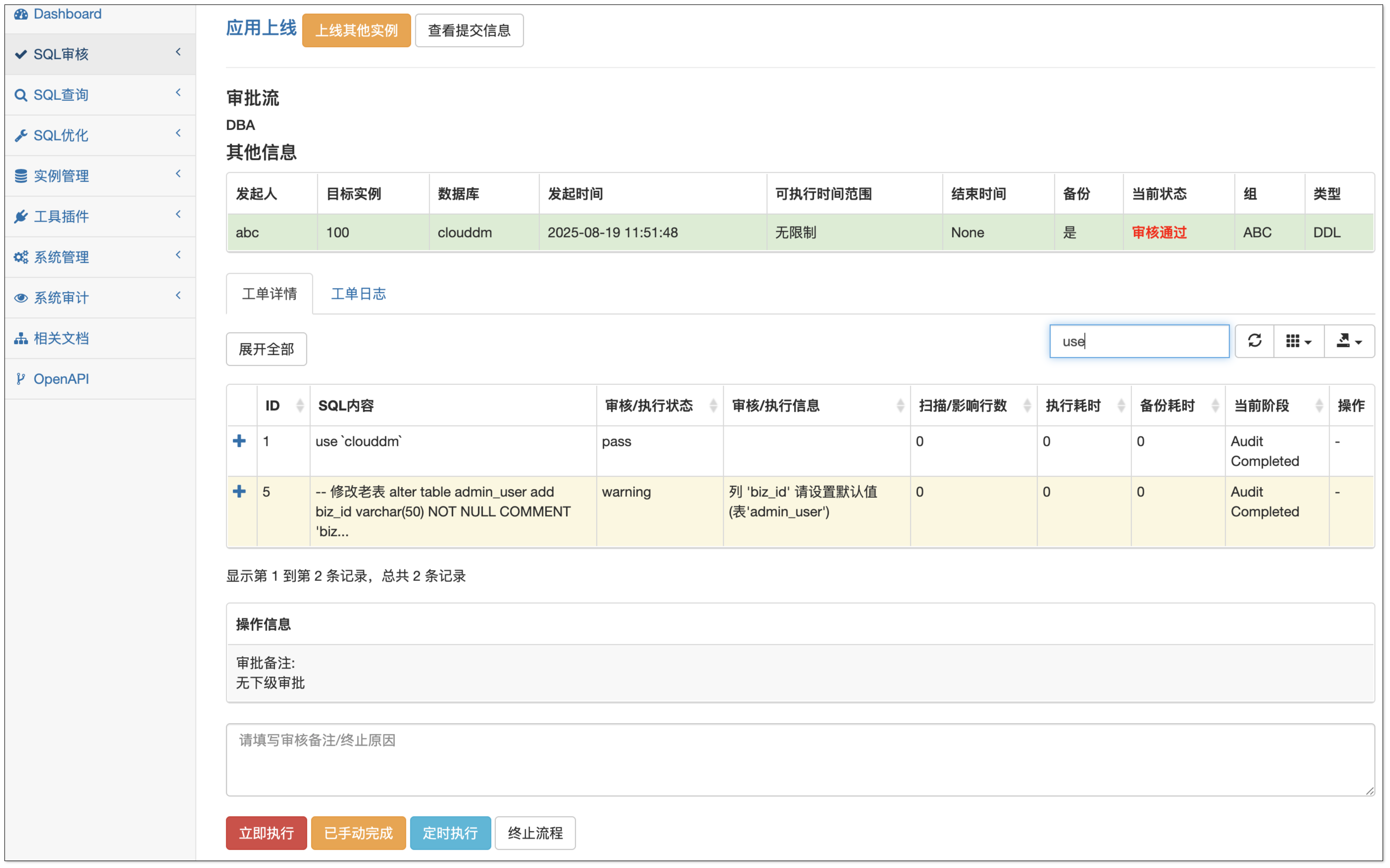 CloudDM 支持以事务方式执行工单,并提供 手动、立即、定时 三种执行模式。选择“已手动完成”意味着 DBA 可以自行处理工单,而不是完全交给系统。这在面对大型数据库或复杂 SQL 时更灵活,可以降低 DBMS 系统带来的不确定性。
