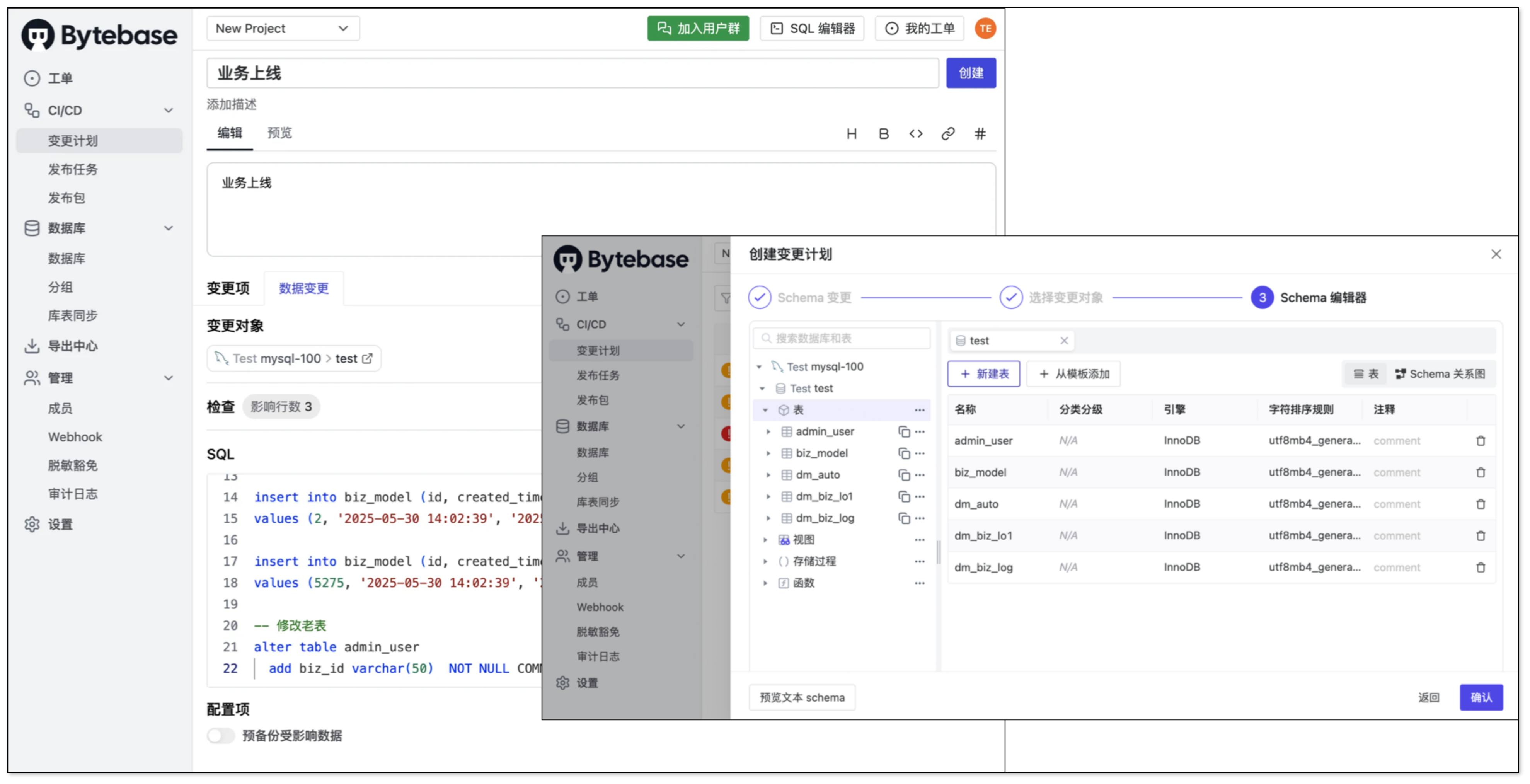 Bytebase 在产品上有 SQL 编辑器、工单 两种模式。SQL 编辑器可以执行 SQL 语句,而工单用于管控变更发布。Bytebase 的设计中,数据库变更主要依托于 Git 的 CI/CD,同时也提供了页面递交工单。通过页面递交工单的入口在 CI/CD 中通过创建变更计划来实现,分为 Schema 变更、**数据变更 **两类。