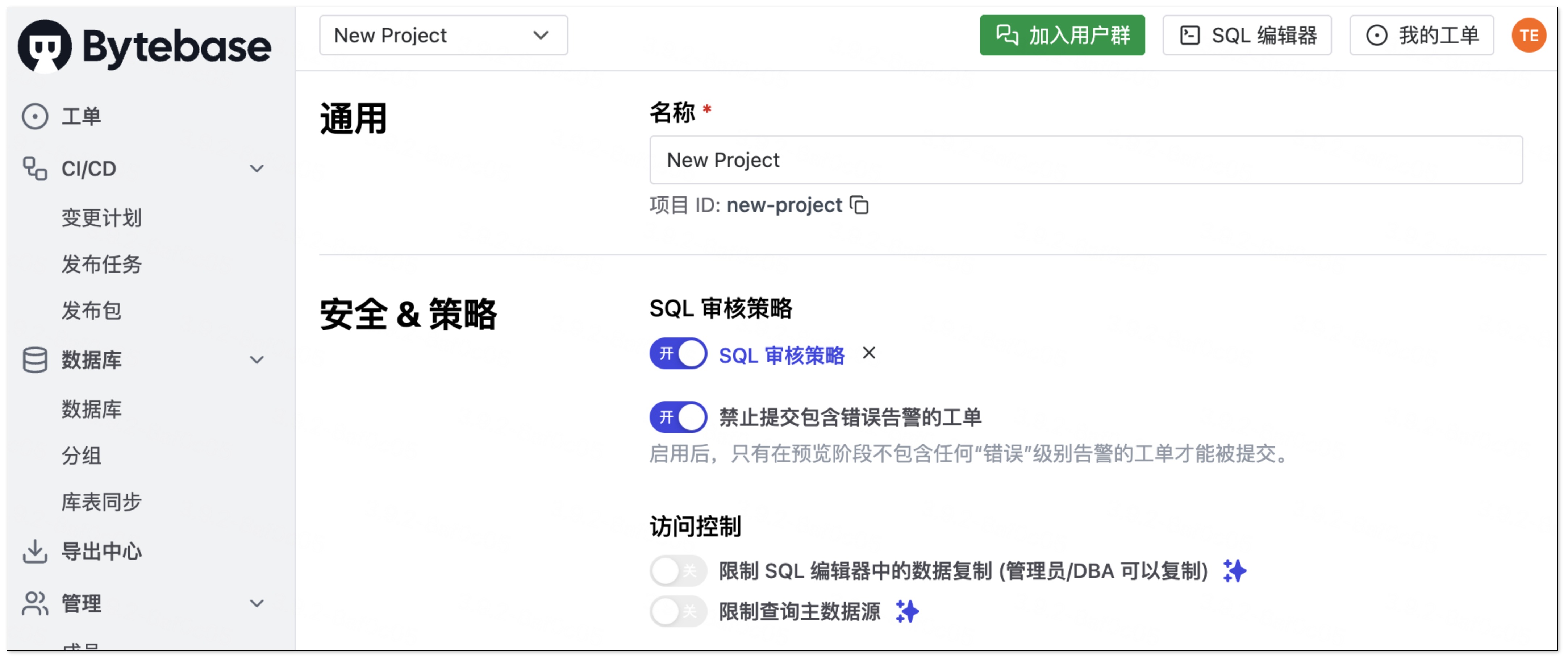 在 Bytebase 创建工单时,SQL 审核默认是非必须环节,即便工单中包含严重的 SQL 错误也可以正常递交工单。因此建议在安全策略中启用 “禁止提交包含错误告警的工单” 选项,防止不符合规范的 SQL 被递交。