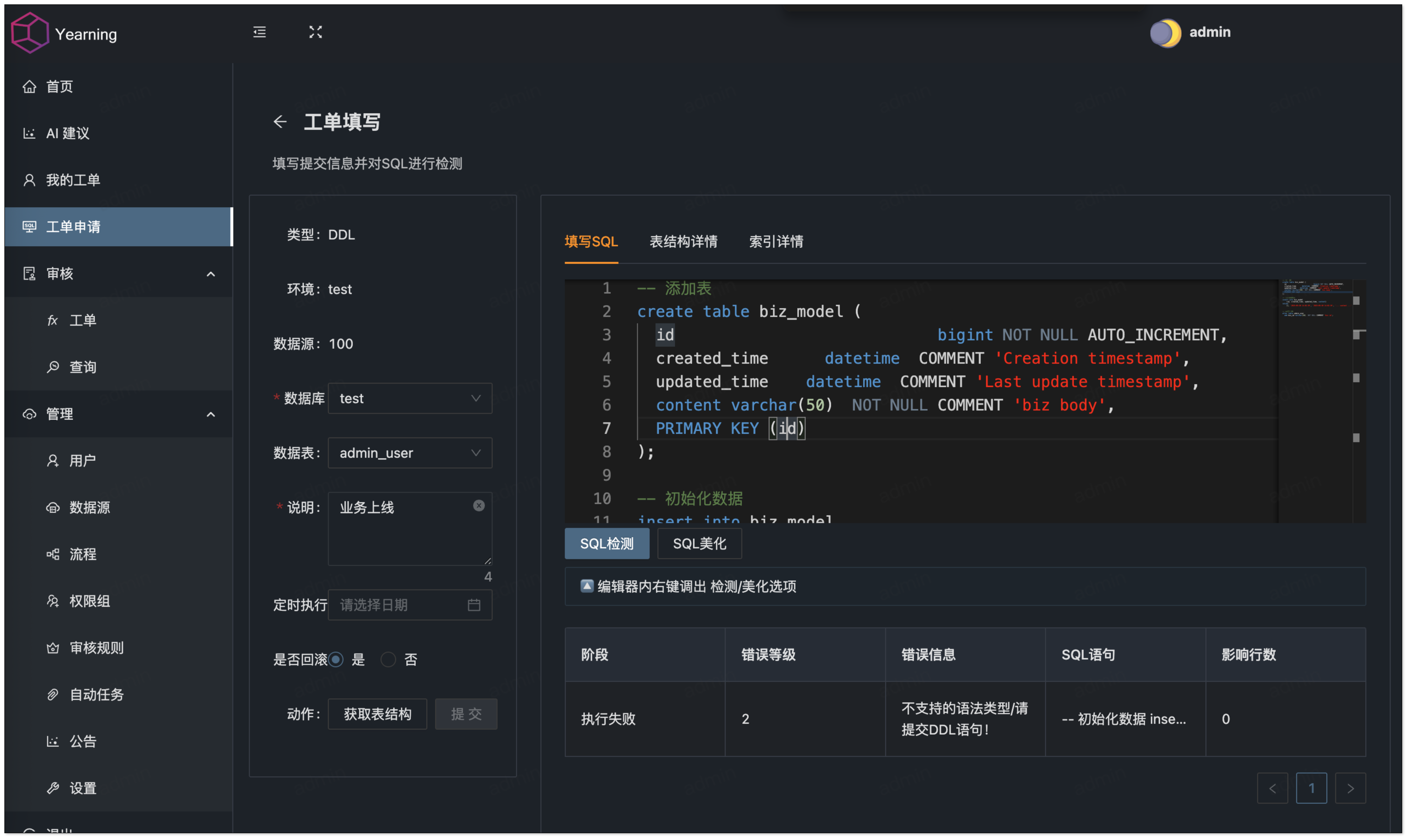 启用 SQL 规则校验后,Yearning 在提交工单时会对 SQL 进行检查,只有通过审核的 SQL 才能提交。