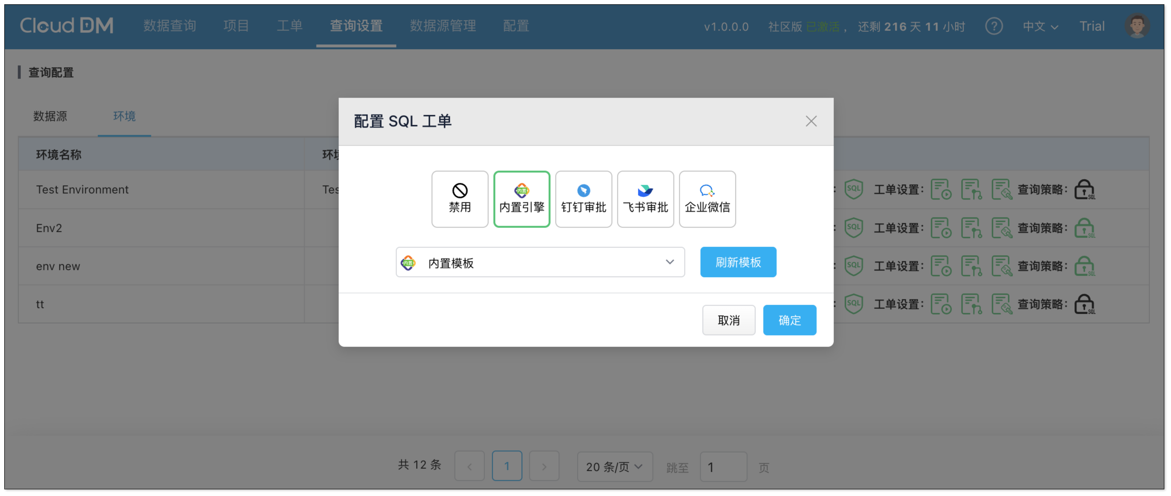 通过修改环境策略,CloudDM 可以禁止环境中数据源的工单功能,在只提供查询的环境中,可以更好地保证数据库的安全。