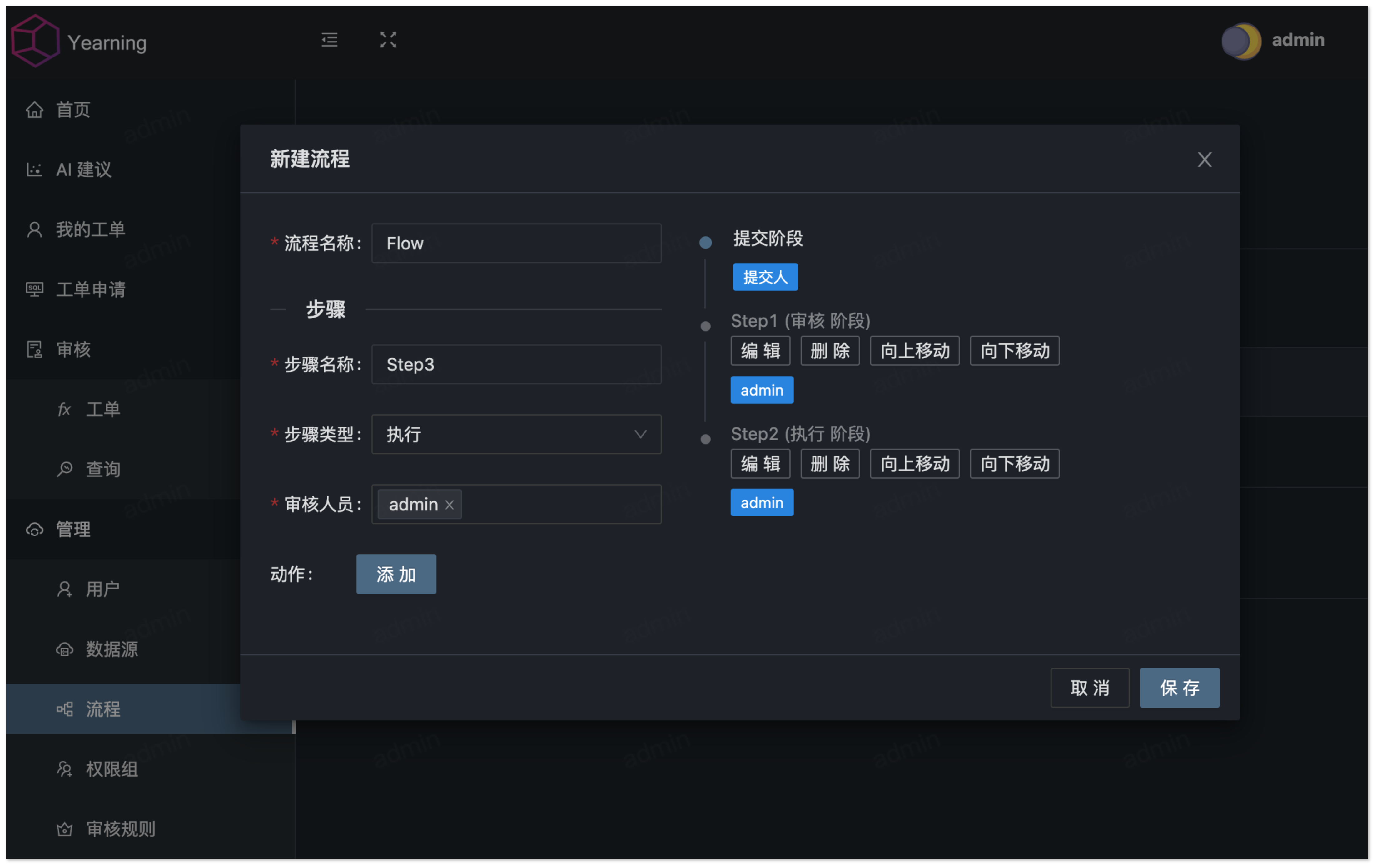 Yearning 不支持外部流程引擎,但可以通过内置流程引擎进行简单节点定义。