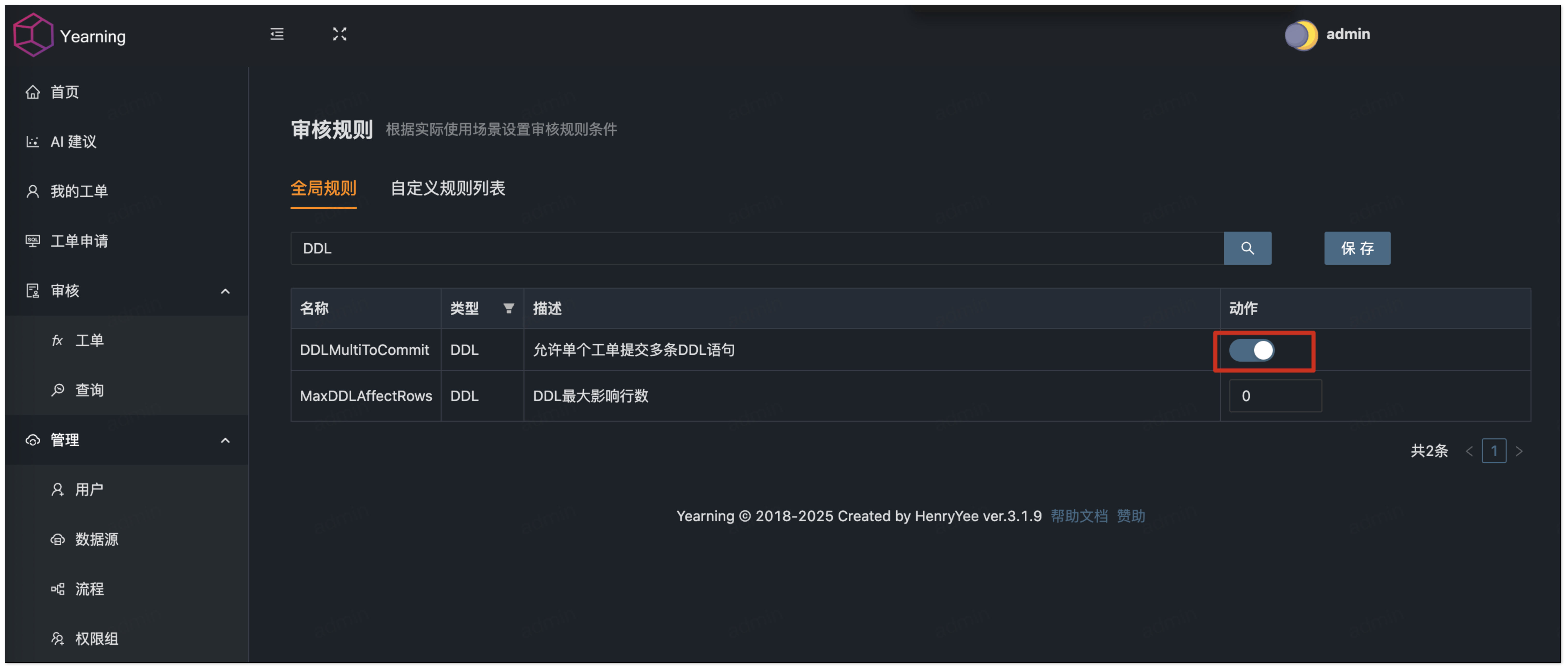 Yearning 默认限制每个 DDL 工单只能包含一条语句,需要在规则中将这个限制改为允许执行多条 DDL,否则实际使用中会比较麻烦。