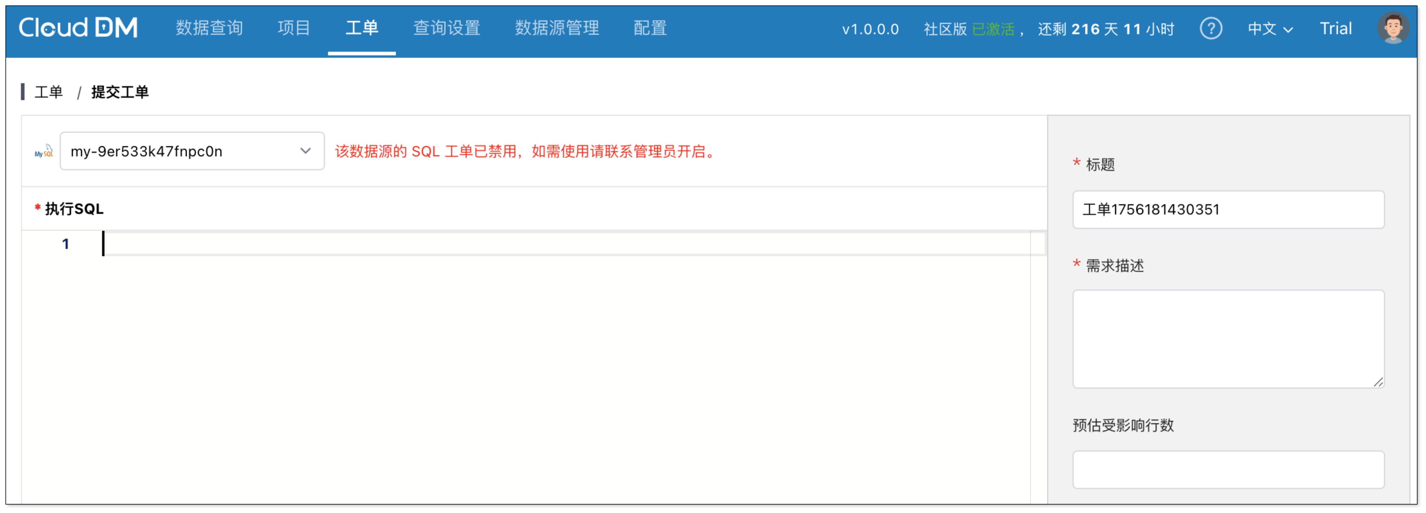 在 CloudDM 中,对数据库的操作分成三类:数据查询、CI/CD 和 工单。默认情况下,查询控制台只能执行查询语句,DDL/DML 需要通过工单才能执行。如果需要,也可以修改环境策略,让它成为一个 SQL 客户端。