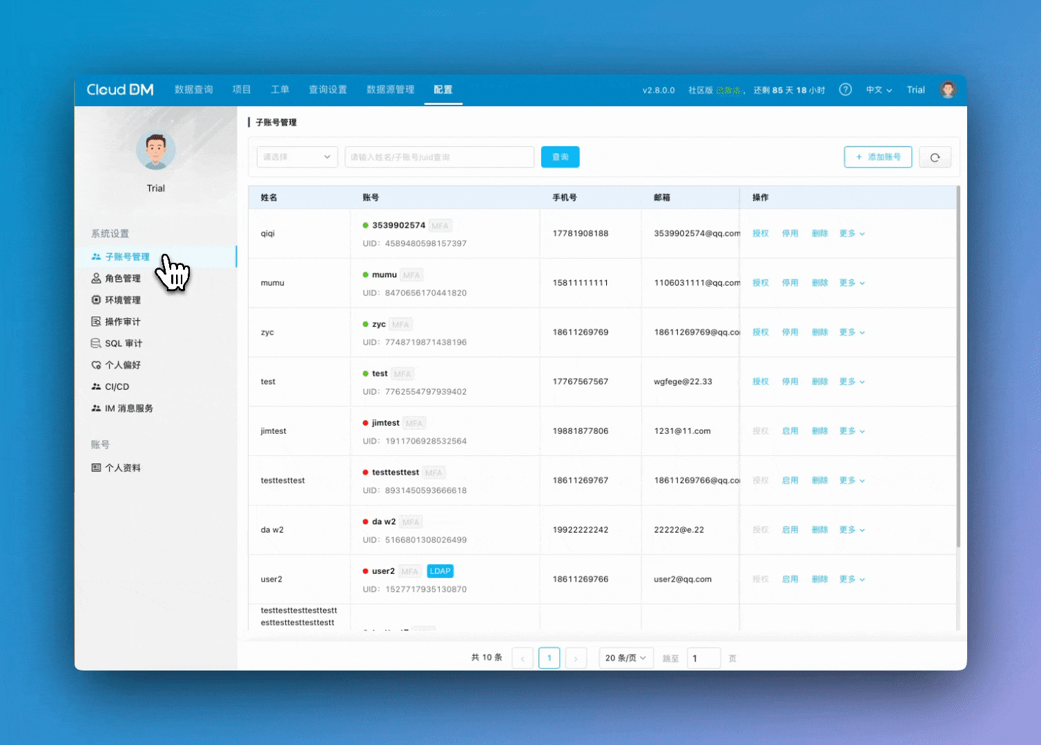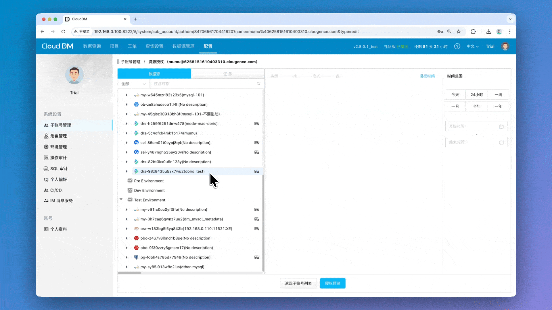 CloudDM 提供基于 RBAC 的精细权限管控,支持到表级别的操作授权。通过明确的角色与权限划分,不仅保障了数据安全,也有效避免了误操作,让团队在管理 Doris 时更加规范、可控。