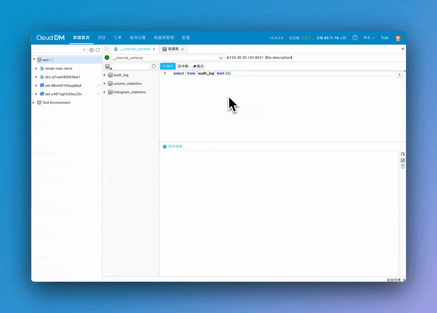 CloudDM 是一款专注团队协作的数据库管理工具,能同时满足开发人员、DBA 等不同人员的需求。针对 Doris 的特性,CloudDM 做了一系列专项适配。
