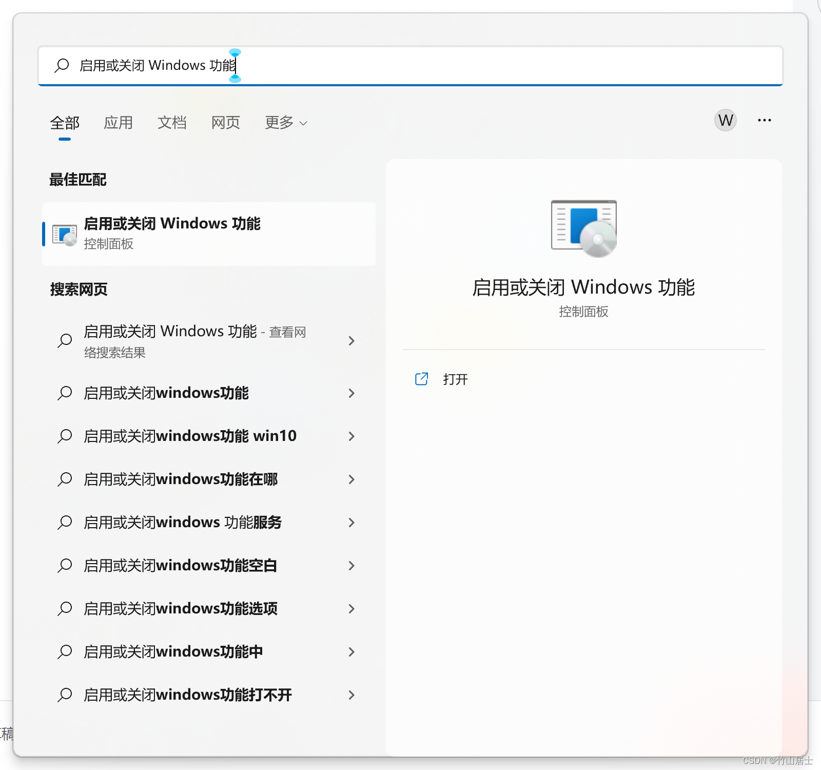 鼠标点任务栏搜索按钮,在搜索框中,输入“启用或关闭 Windows 功能”,在右侧最佳匹配中,点打开。