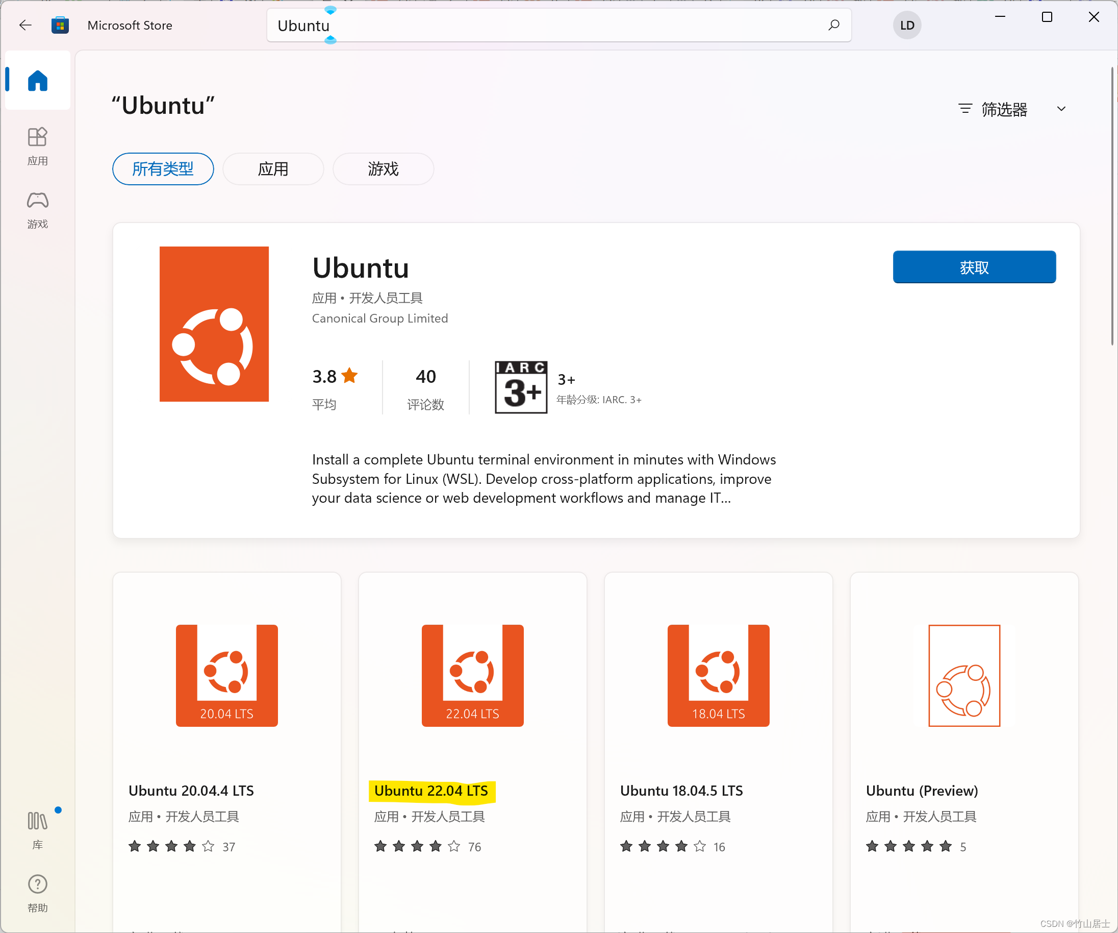 在Microsoft Store窗口的搜索框中输入ubuntu,可以看到多个版本的Ubuntu。