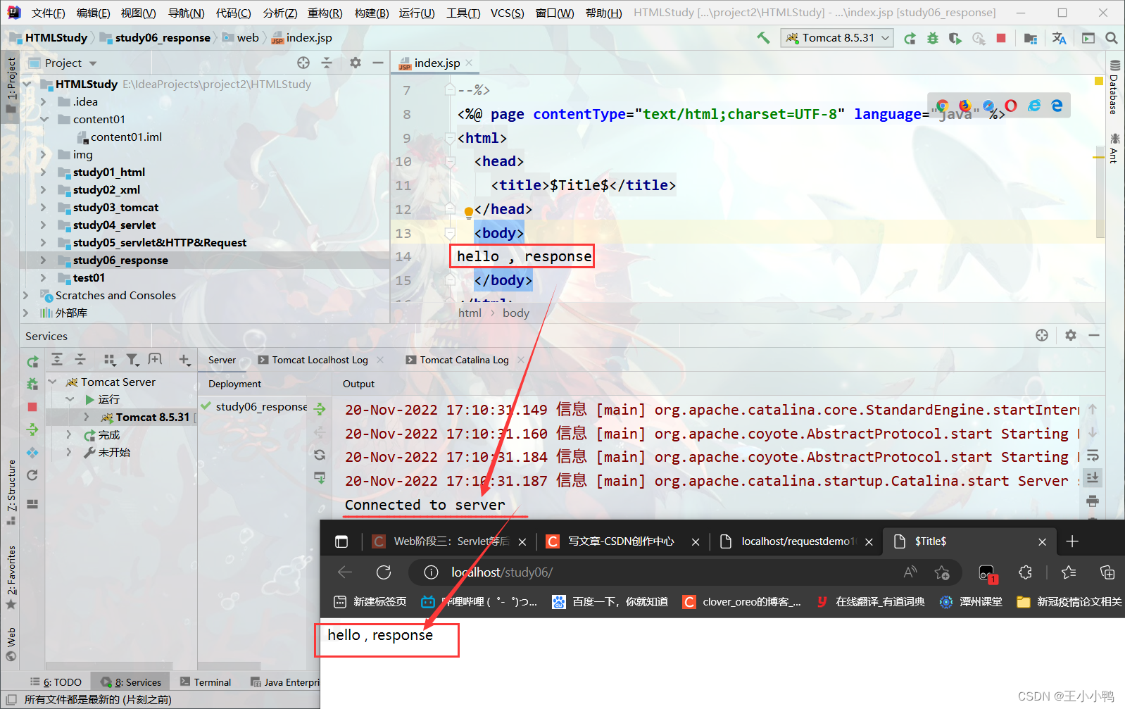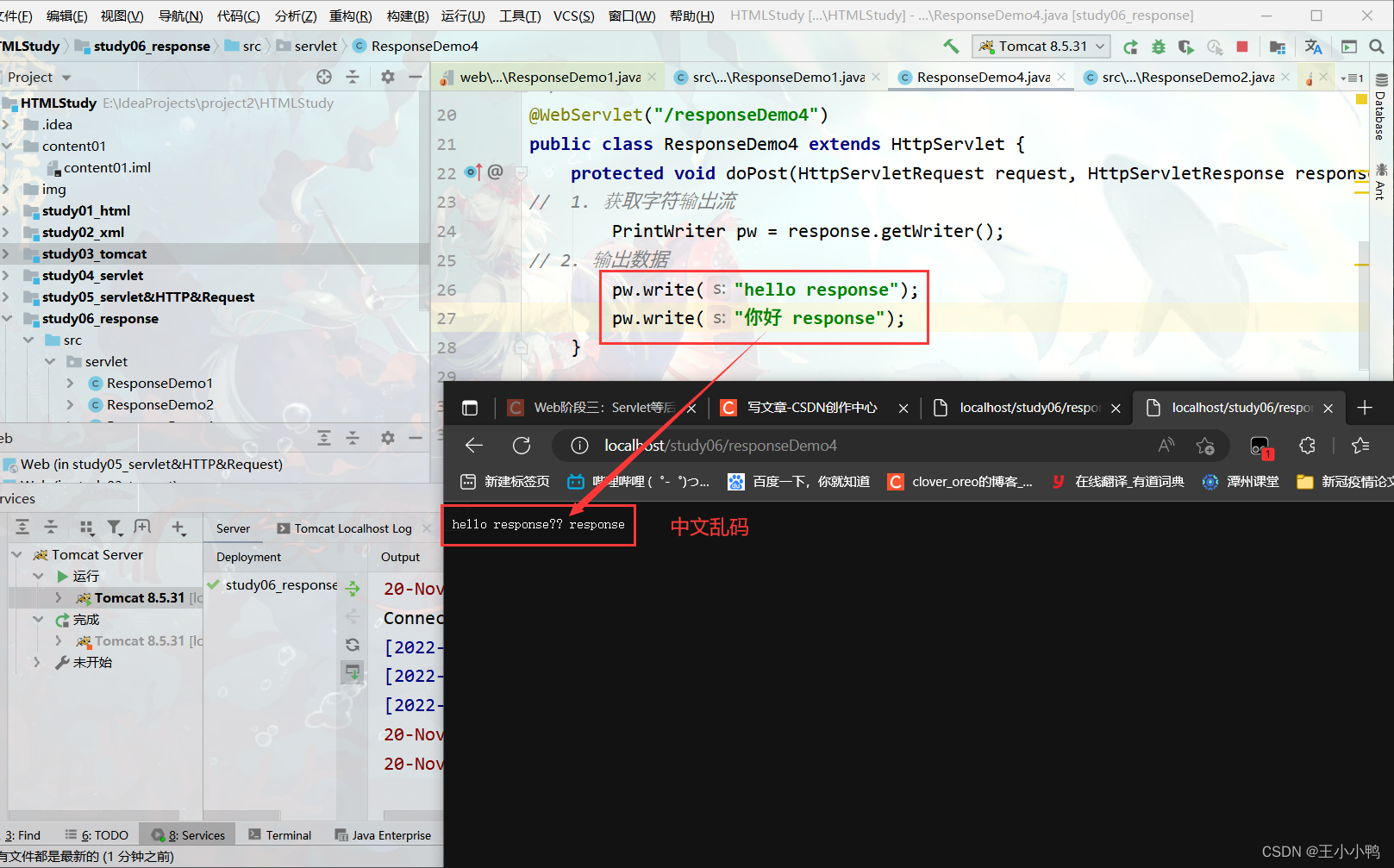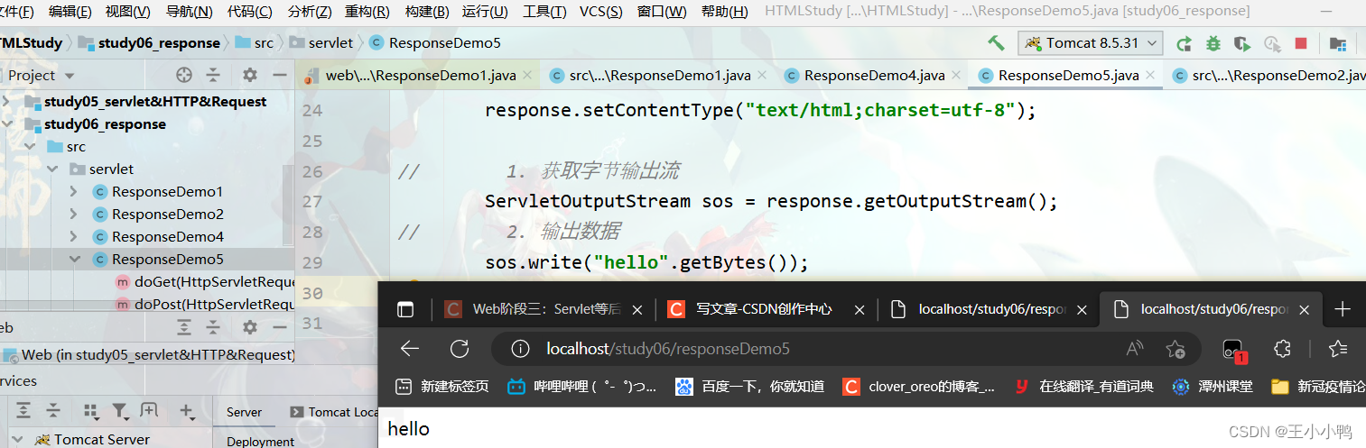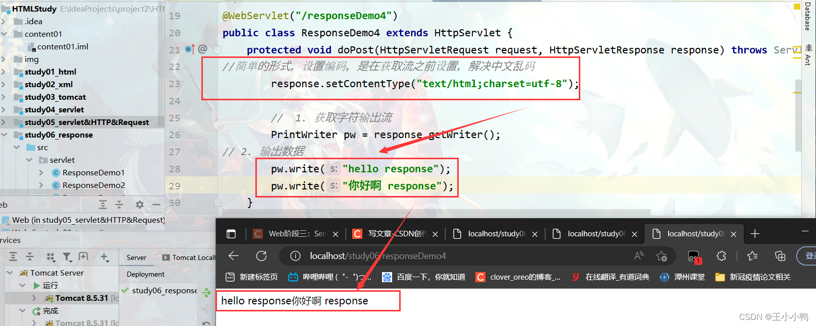 查阅资料后得知: response中表示响应,我们经常用于设置返回给客户端的内容〈输出),out也是给用户做输出使用的。