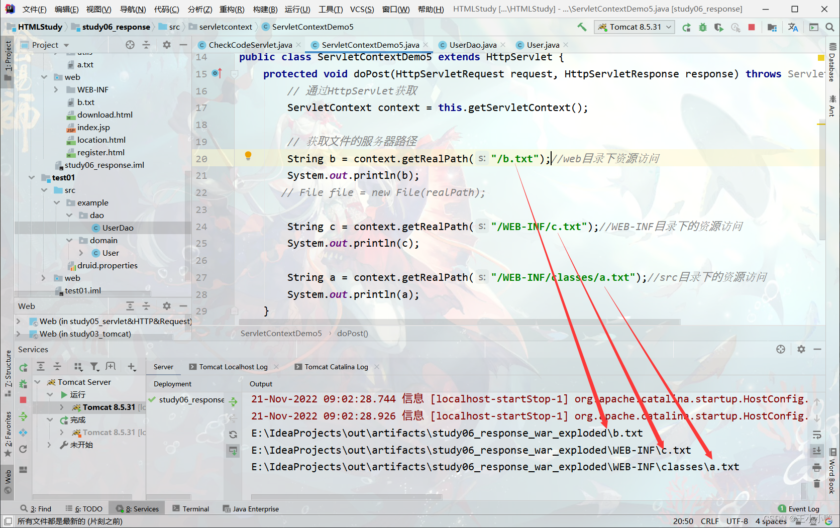 String b = context.getRealPath("/b.txt");//web目录下资源访问
