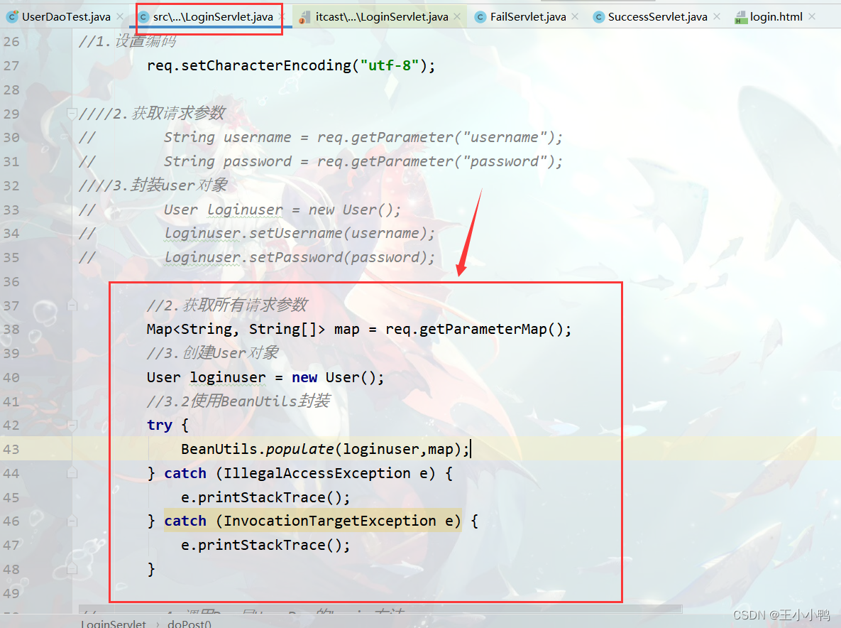 注释掉之前的2,3,用BeanUtils.populat()方法来写