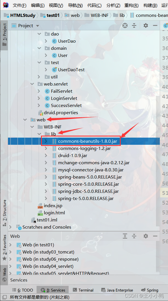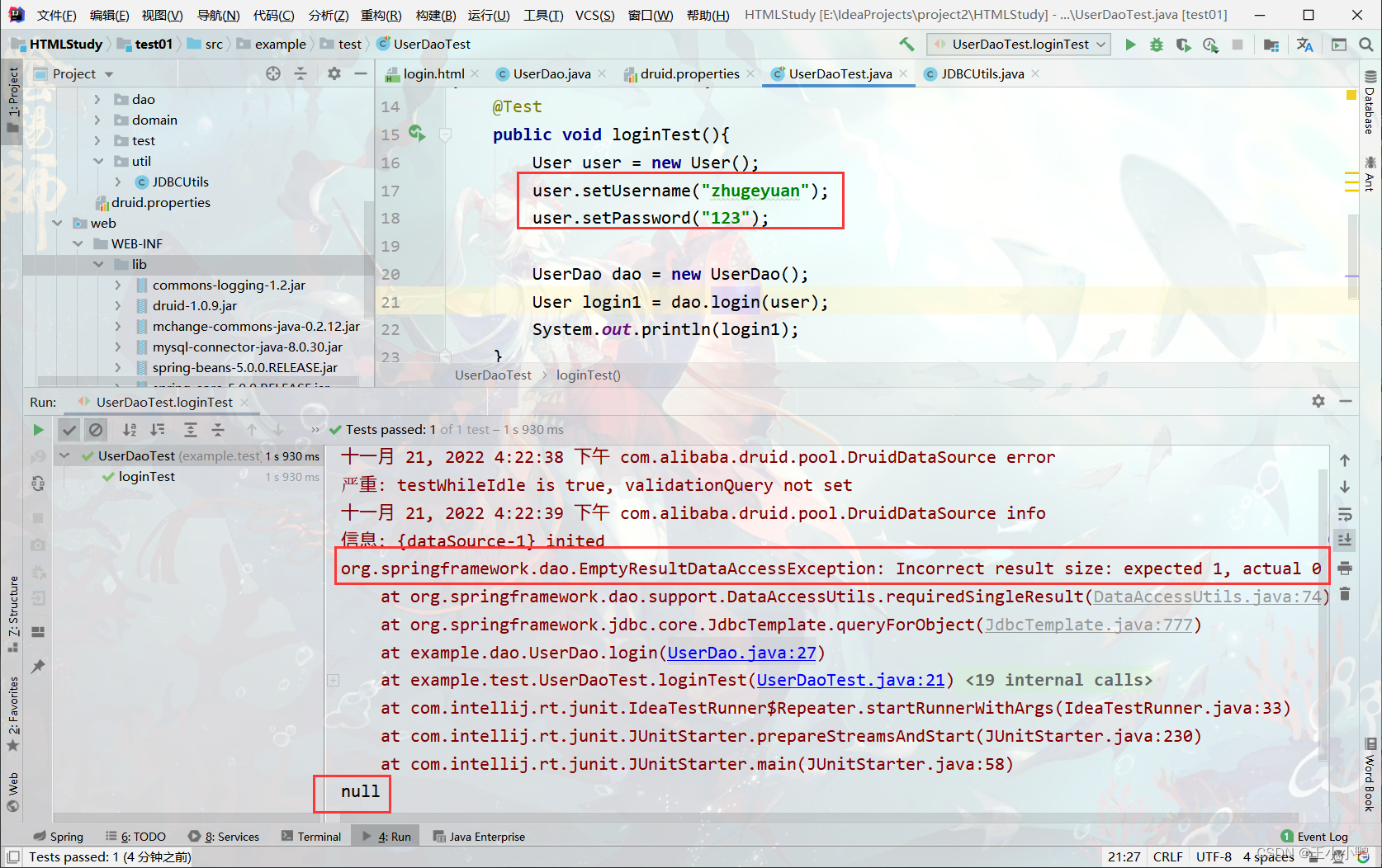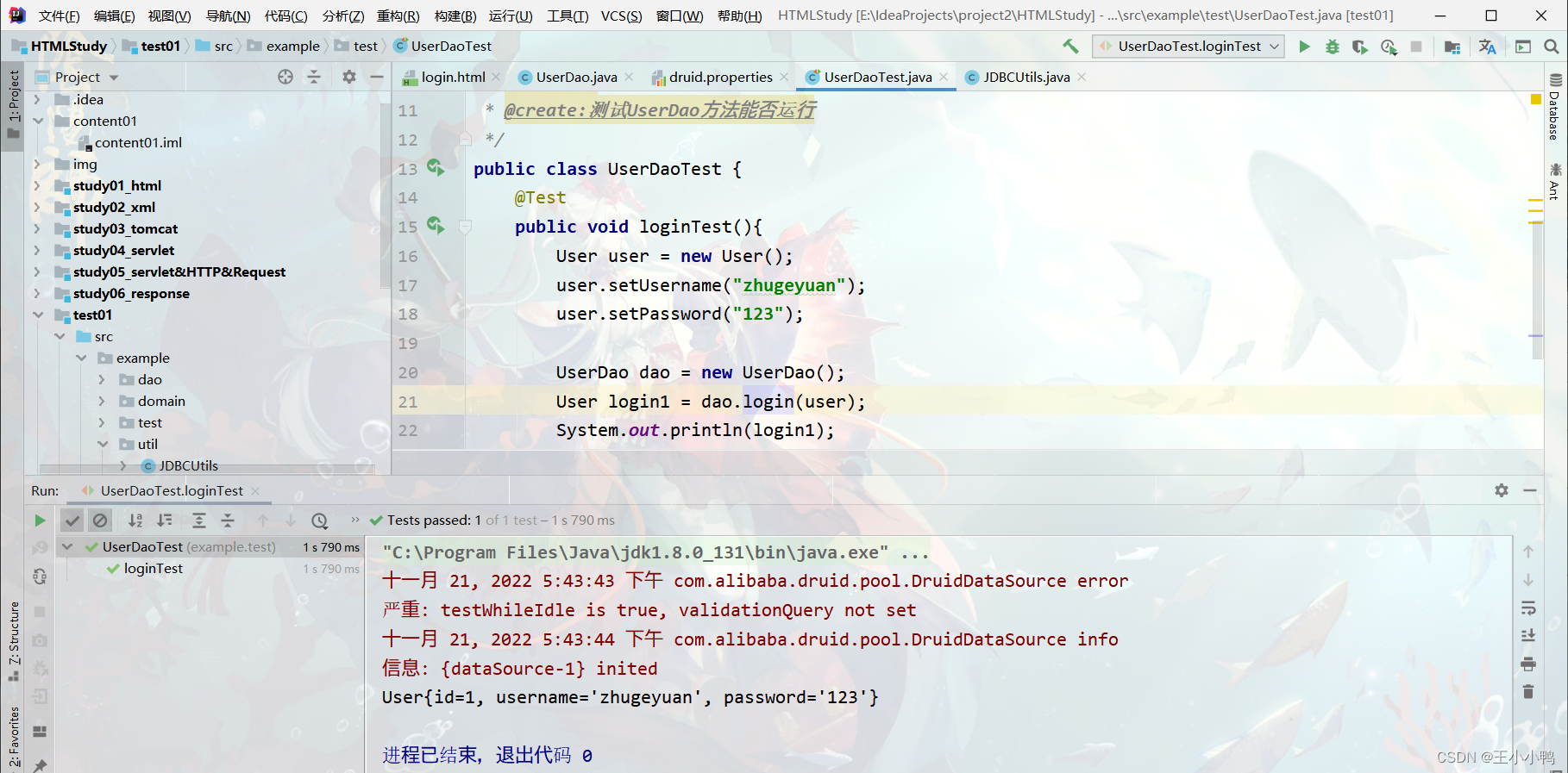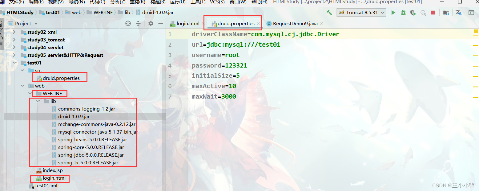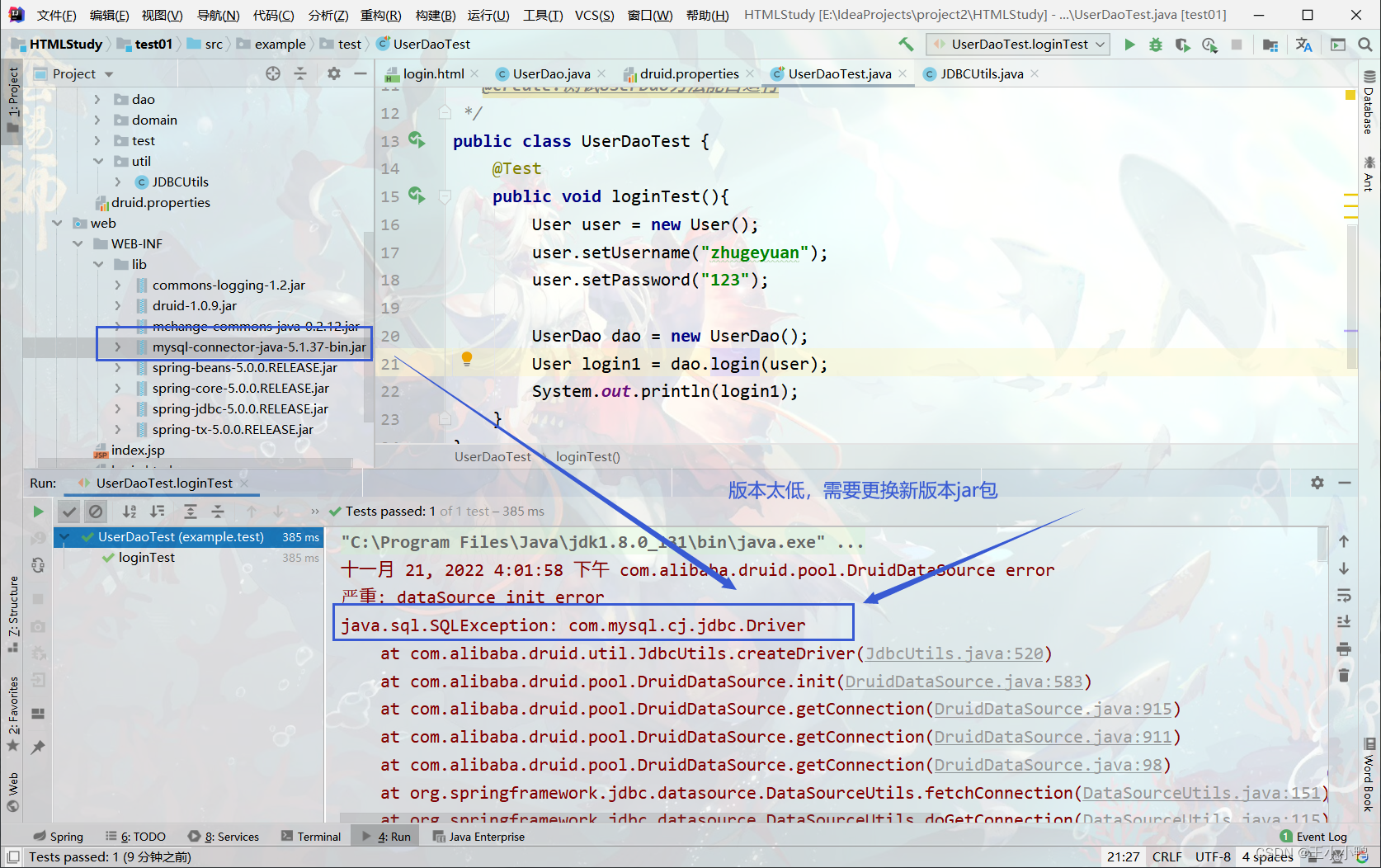 出错,测试不通过,连接不到druid连接池,初步猜想应该是之前的版本过低,mysql版本过高引起的兼容问题。更换对应版本jar包