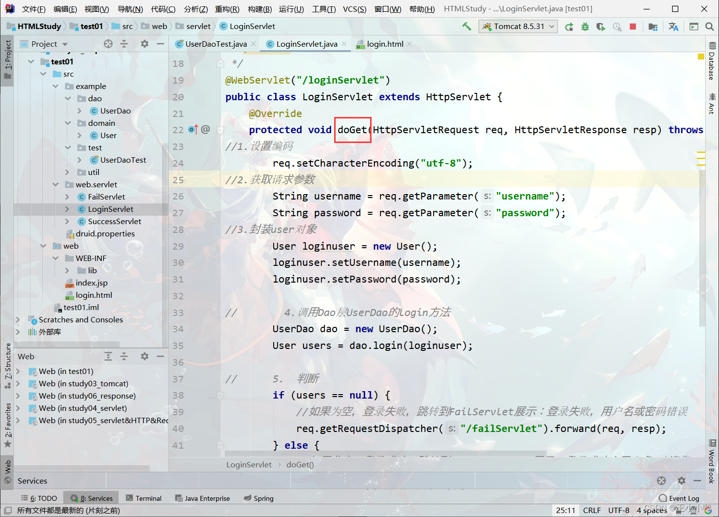 //如果为空,登录失败,跳转到FailServlet展示:登录失败,用户名或密码错误
