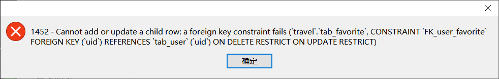1452 -Cannot add or update a child row: a foreign key constraint fails (travel. tab favorite , CONSTRAINT 'FK user favoriteFOREIGN KEY (uid )REFERENCES 'tab_user' (uid ) ON DELETE RESTRICT ON UPDATE RESTRICT)