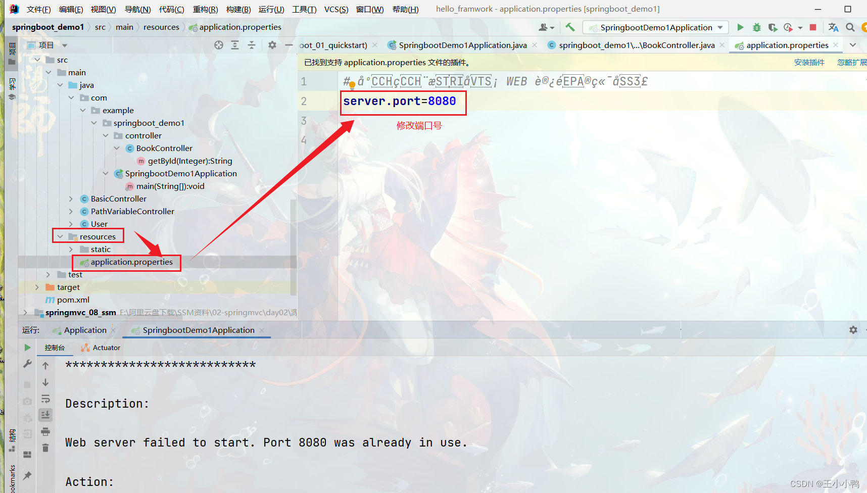 当遇到这个问题时,我们可以创建一个新的端口号来重新执行SpringBoot项目,创建新的端口号其实很简单,只需要在application.yaml或者application.properties文件下配置即可。