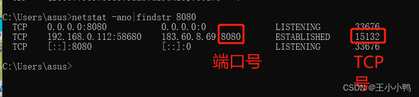 (1)打开 cmd命令窗口,输入netstat -ano|findstr 端口号 命令,查询该端口对应的TCP号;
