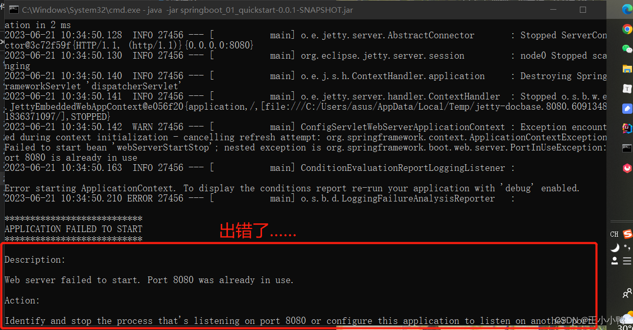 8080端口被占用,关闭正在使用这个端口的程序(我之前在idea上启动了服务器,关闭即可)