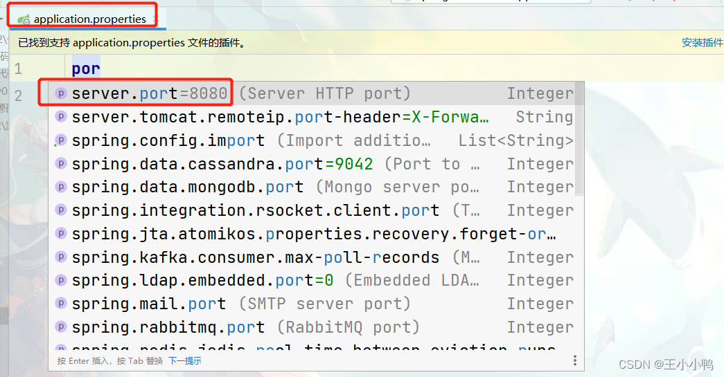 现在需要进行配置,配合文件必须放在 resources 目录下,而该目录下有一个名为 application.properties 的配置文件,我们就可以在该配置文件中修改端口号,在该配置文件中书写 port ,Idea 就会提示,如下