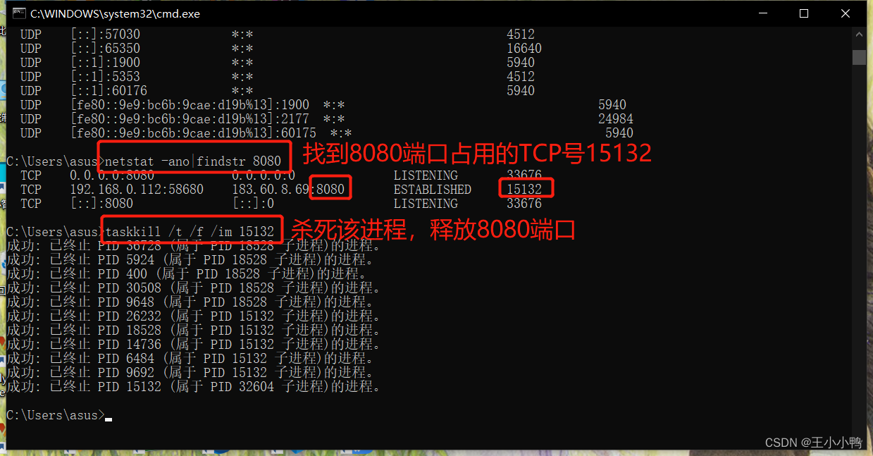(2)输入taskkill /t /f /im TCP号,来关闭被占用的端口