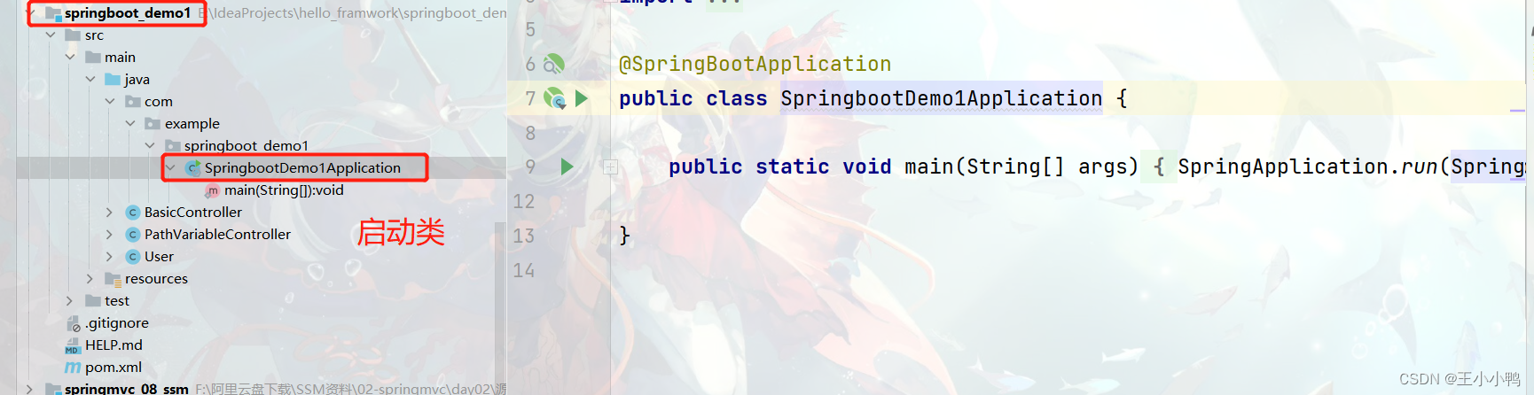 这个类中的东西很简单,就在类上添加了一个 @SpringBootApplication 注解,而在主方法中就一行代码。我们在启动服务器时就是执行的该类中的主方法。