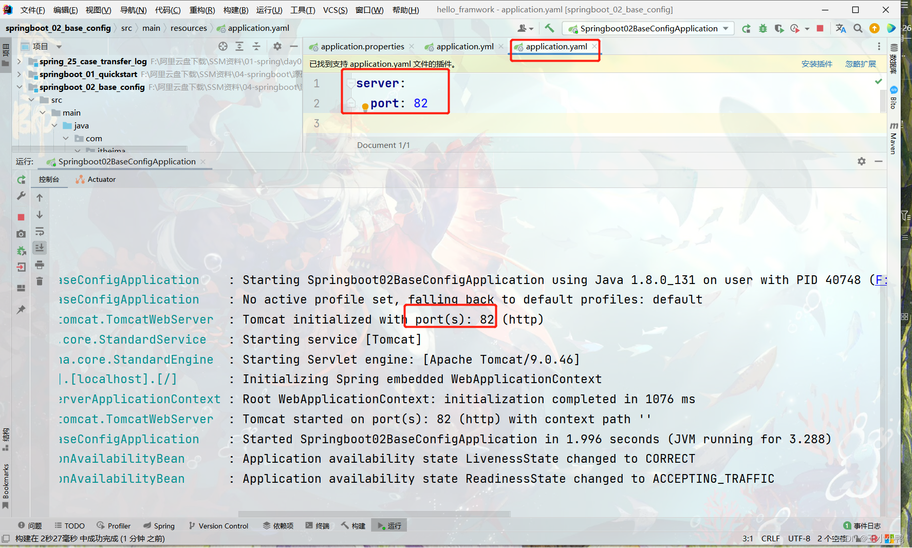 删除 application.properties 配置文件中的内容。在 resources 下创建一个名为 application.yml 的配置文件,在该文件中书写端口号的配置项,格式如下: