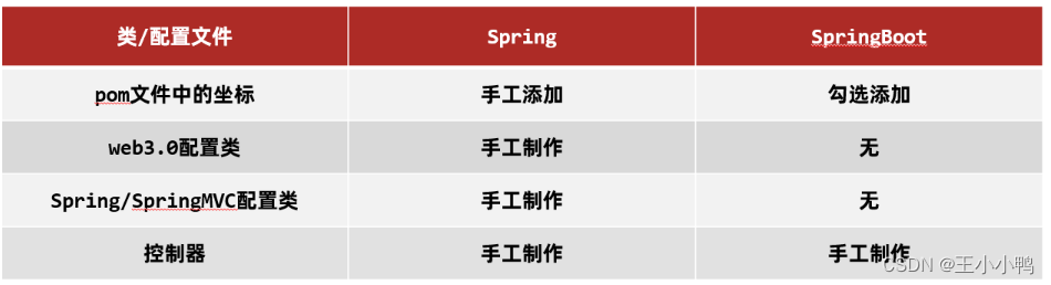Spring/SpringMVC程序的配置类需要自己书写。而SpringBoot程序则不需要书写。