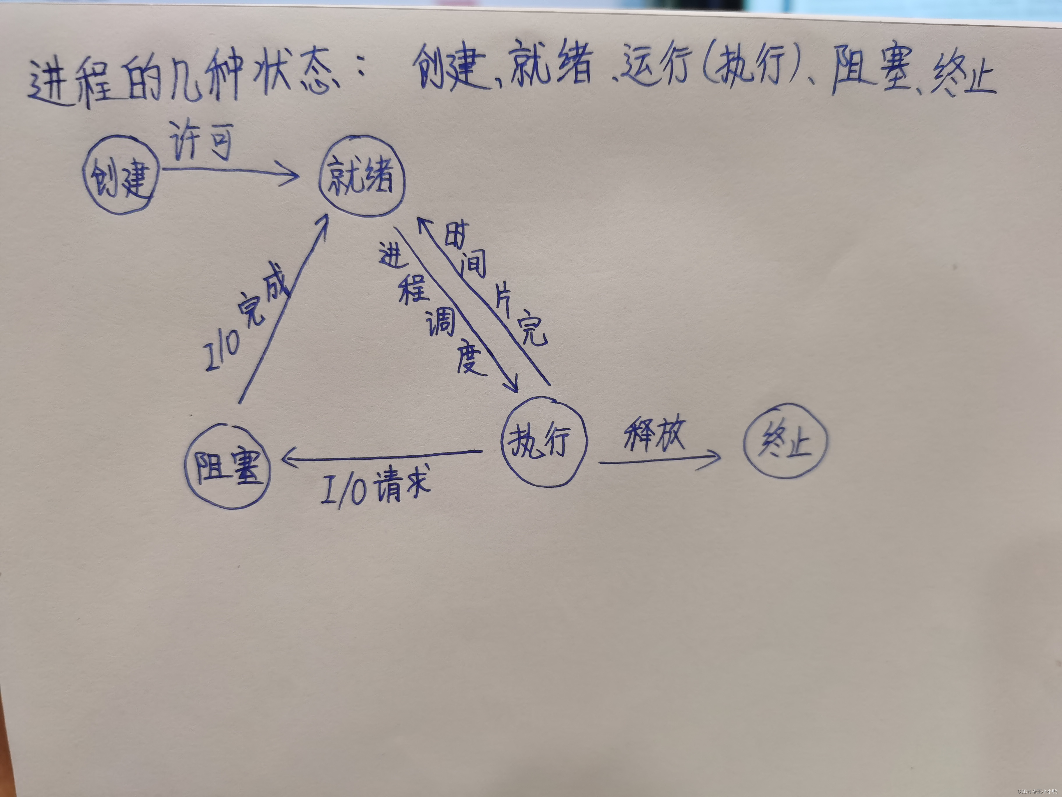 有3种状态4种转换,三种状态是阻塞、就绪、运行。四种转换是阻塞->就绪、就绪->阻塞、运行->阻塞、就绪->运行。